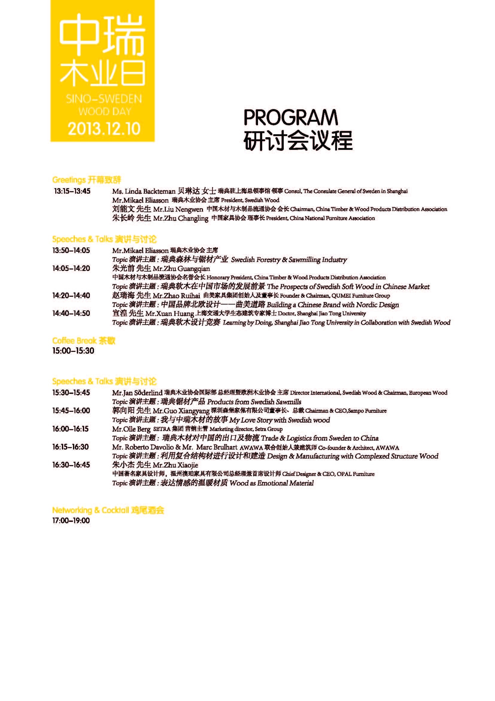 此次会议分为上下午两个阶段,来自国内的知名家具企业负责人将做精彩演讲,与会者将了解到瑞典锯木产业的状况,其中包括瑞典的森林管理,产品的物流运输及瑞典锯木材的分级标准等重要信息。