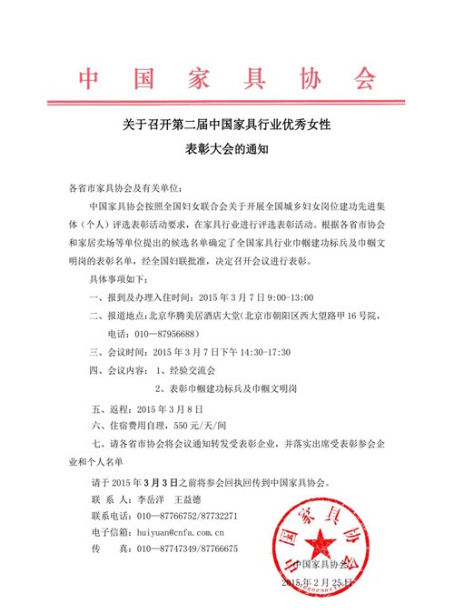 关于召开第二届中国家具行业优秀女性表彰大会的通知