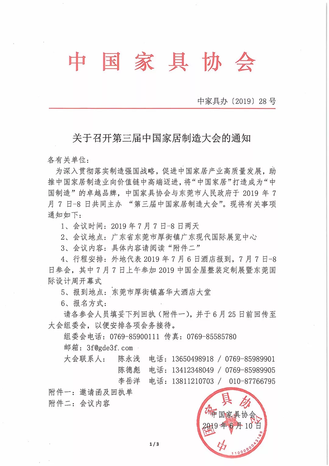 关于召开第三届中国家居制造大会的通知--中家具办〔2019〕28号