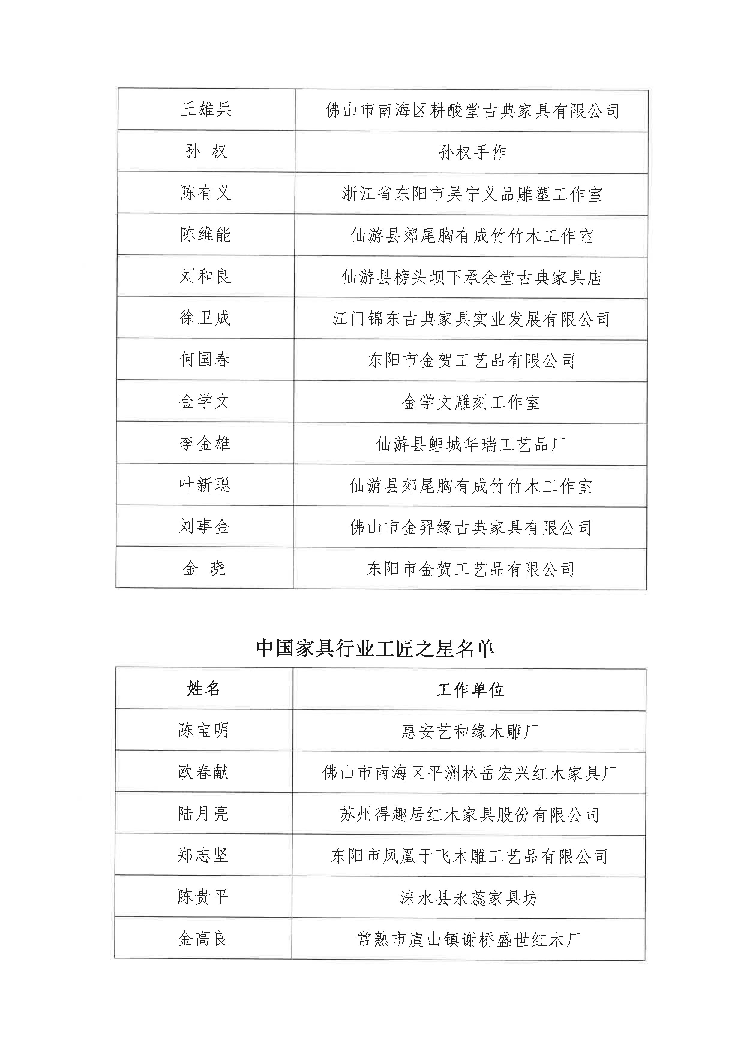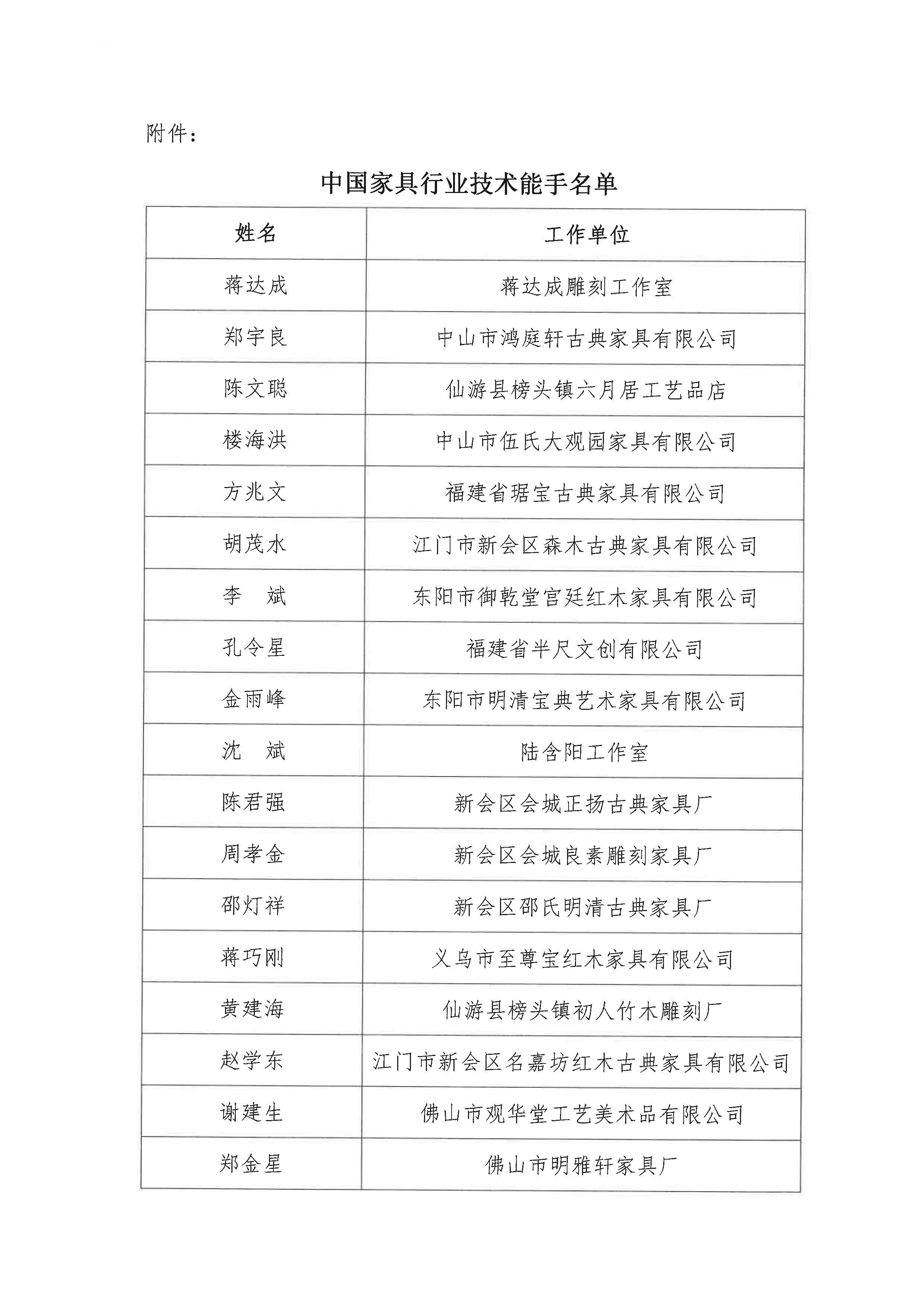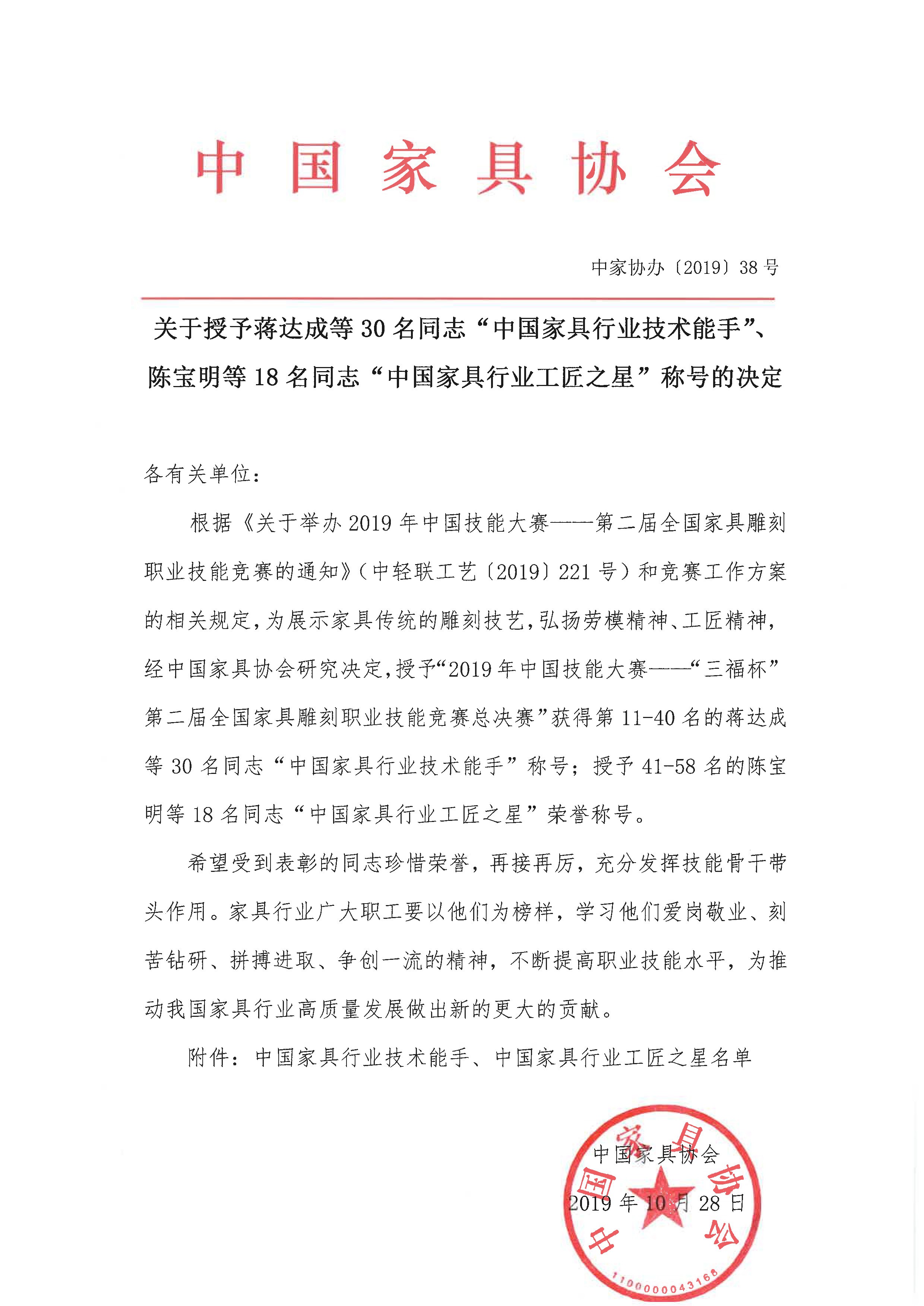关于授予蒋达成等30名同志“中国家具行业技术能手”、陈宝明等18名同志“中国家具行业工匠之星”称号的决定