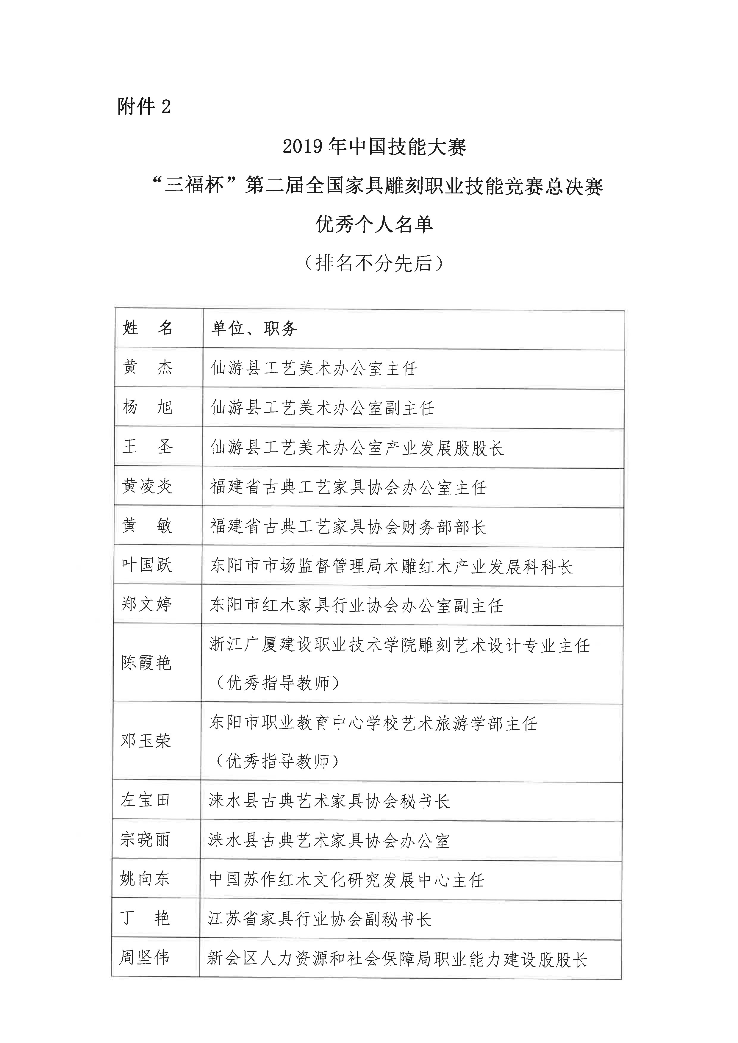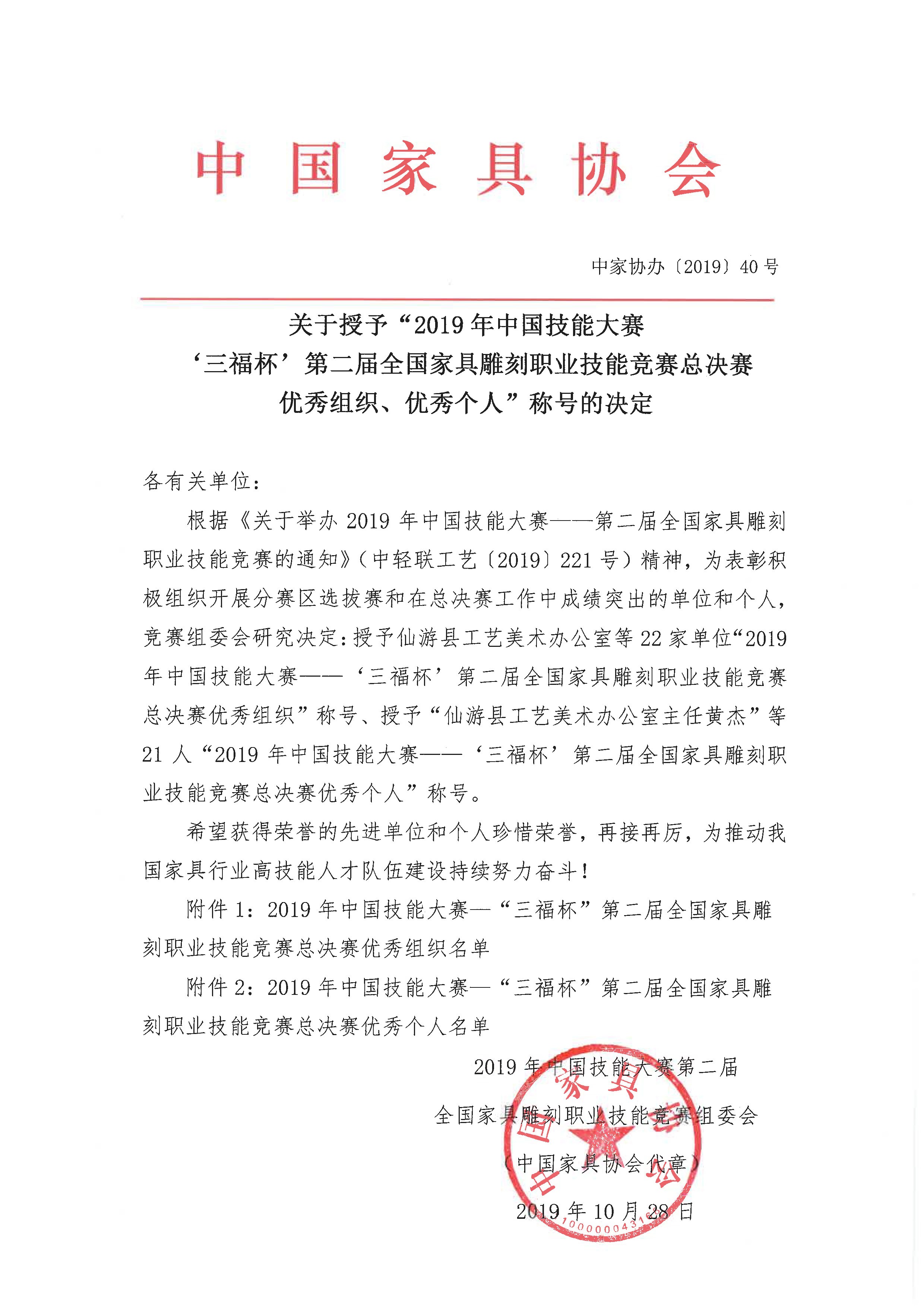 关于授予“2019年中国技能大赛——‘三福杯’第二届全国家具雕刻职业技能竞赛总决赛优秀组织、优秀个人”称号的决定