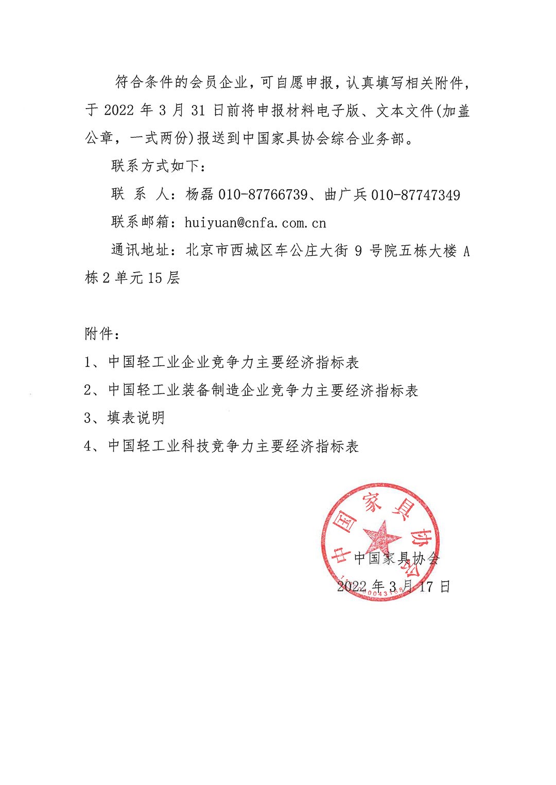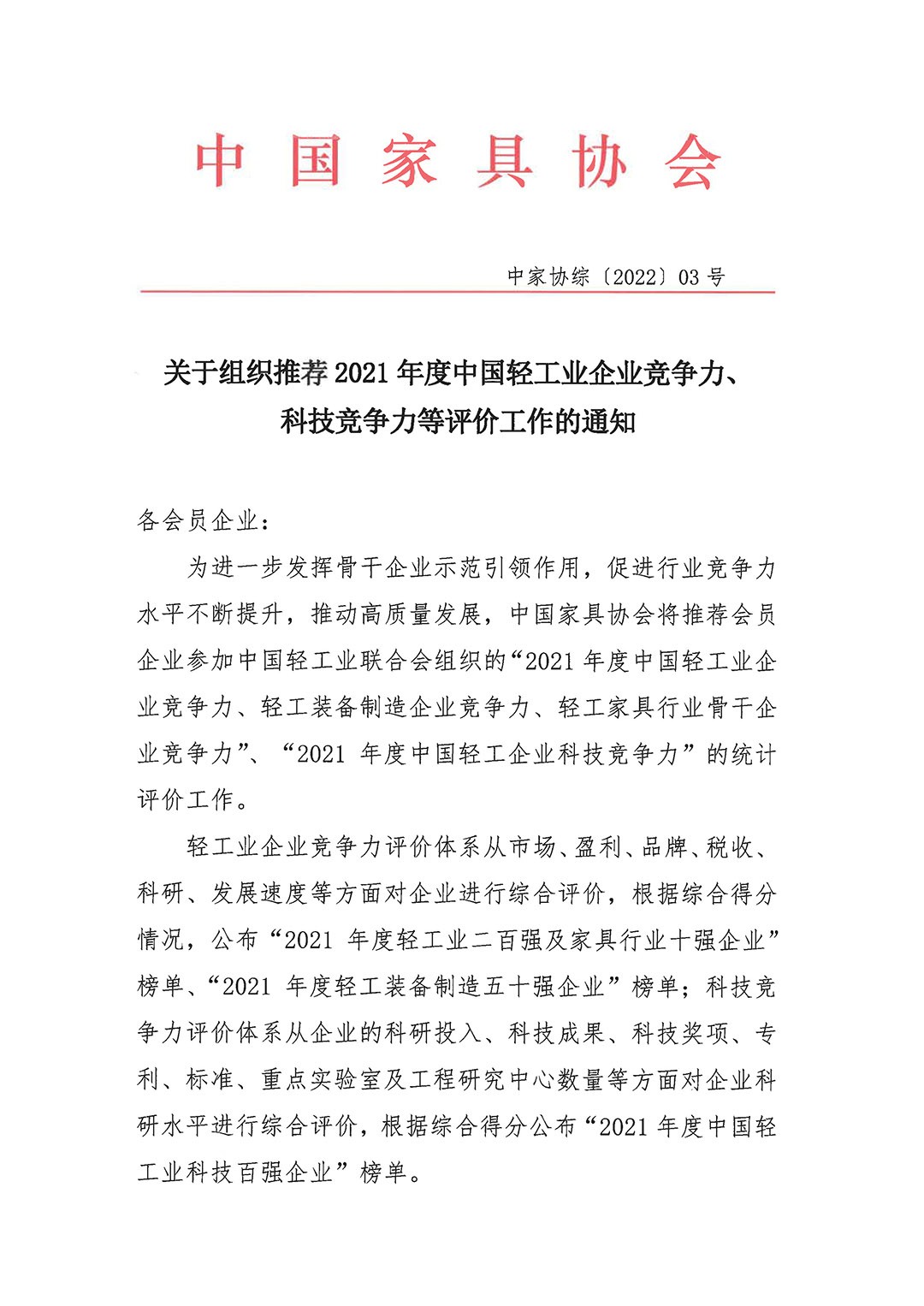 关于组织推荐2021年度中国轻工业企业竞争力、科技竞争力等评价工作的通知