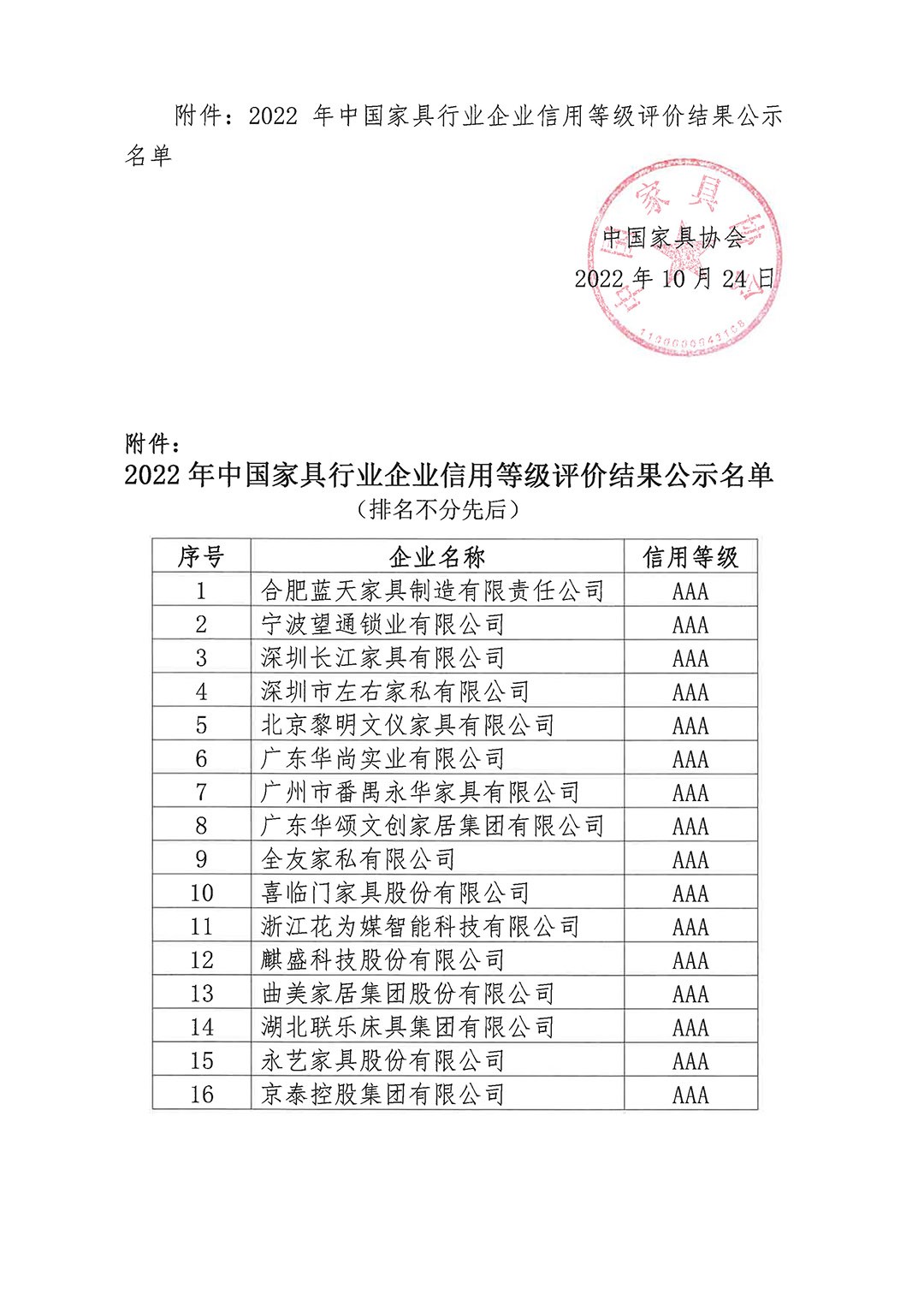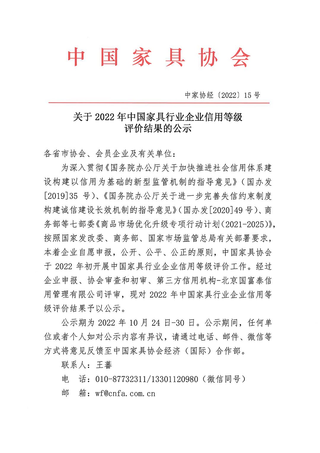 关于2022年中国家具行业企业信用等级评价结果的公示