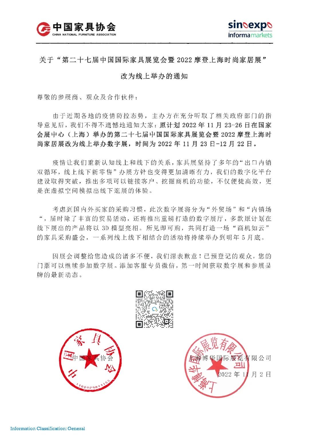 关于“第二十七届中国国际家具展览会暨2022摩登上海时尚家居展”改为线上举办的通知