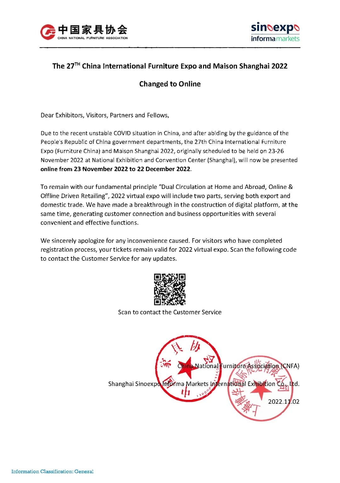主办方在充分听取了相关政府部门的指导意见后,我们不得不遗憾地通知大家:原计划2022年11月23-26日在国家会展中心(上海)举办的第二十七届中国国际家具展览会暨2022摩登上海时尚家居展改为线上举办数字展,时间为2022年11月23日-12月22日。
