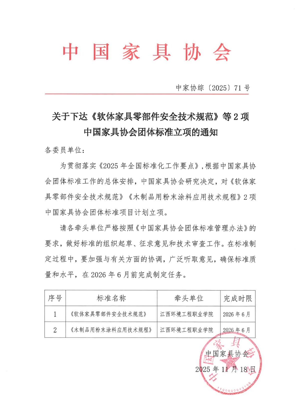 关于下达《软体家具零部件安全技术规范》等2项 团体标准立项的通知