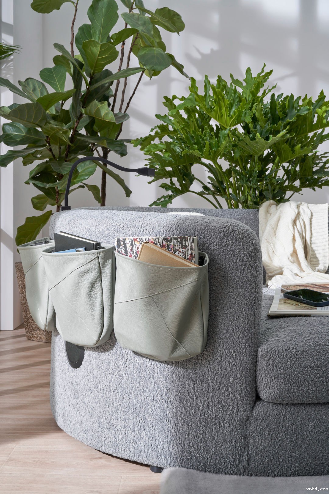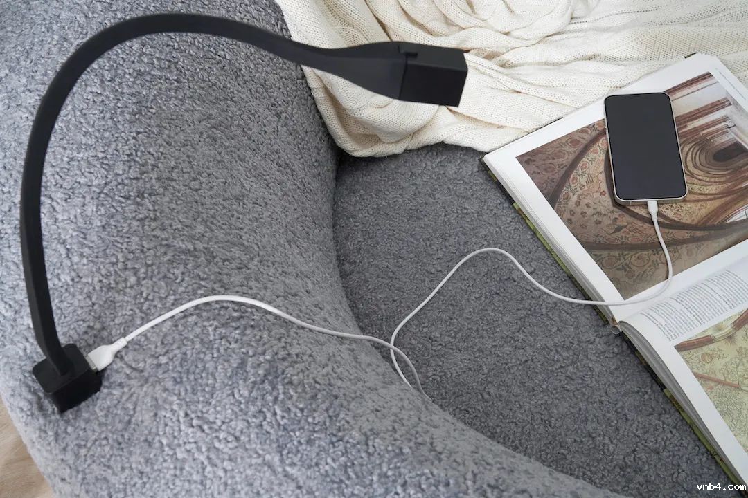 In terms of function, it integrates multiple ones such as storage, rest, lighting, charging and audio. There are three detachable storage bags made of cow leather on the back of the sofa, which is convenient to be used to store books, food, paper towels and other daily necessities. A flexible LED reading lamp is equipped at the backrest, and it has a USB charging port under the lamp base for electronic equipment. There are two Bluetooth speakers with output power of 6W set inside the sofa, and another two speakers on each side of the back to create a three-dimensional listening experience.