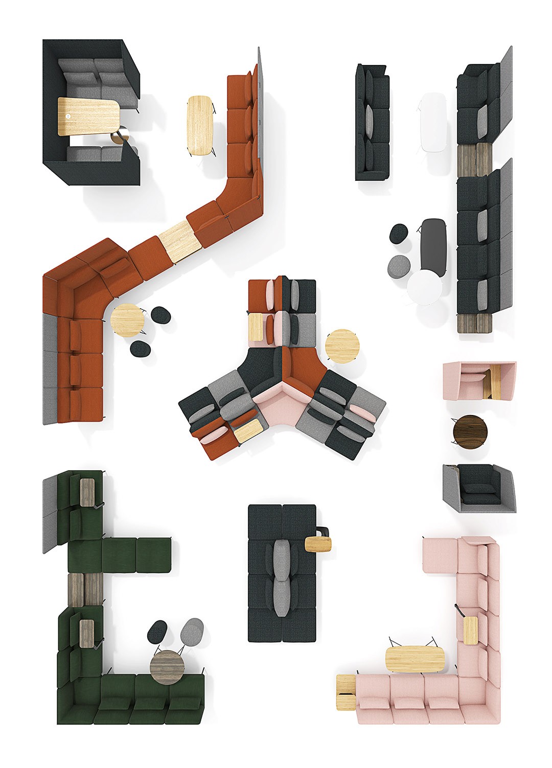 Puffy模块沙发适合新办公ABW工作模式,用不同形态的小沙发定制出无穷无尽的造型,彰显空间个性和多元化。
