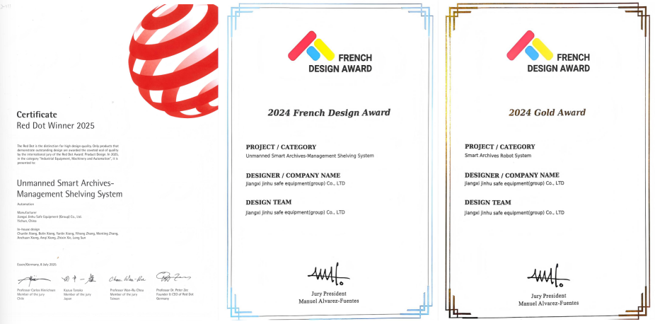 这种“传承与创新”的双螺旋模式,使产品既保持了卓越的耐用性,又注入了强大的“智能基因”。金虎的产品屡获国际认可:2024年法国DNA设计大奖、2023年法国Janus工业设计奖,智能档案机器人系统更是斩获“2024法国设计奖金奖”。