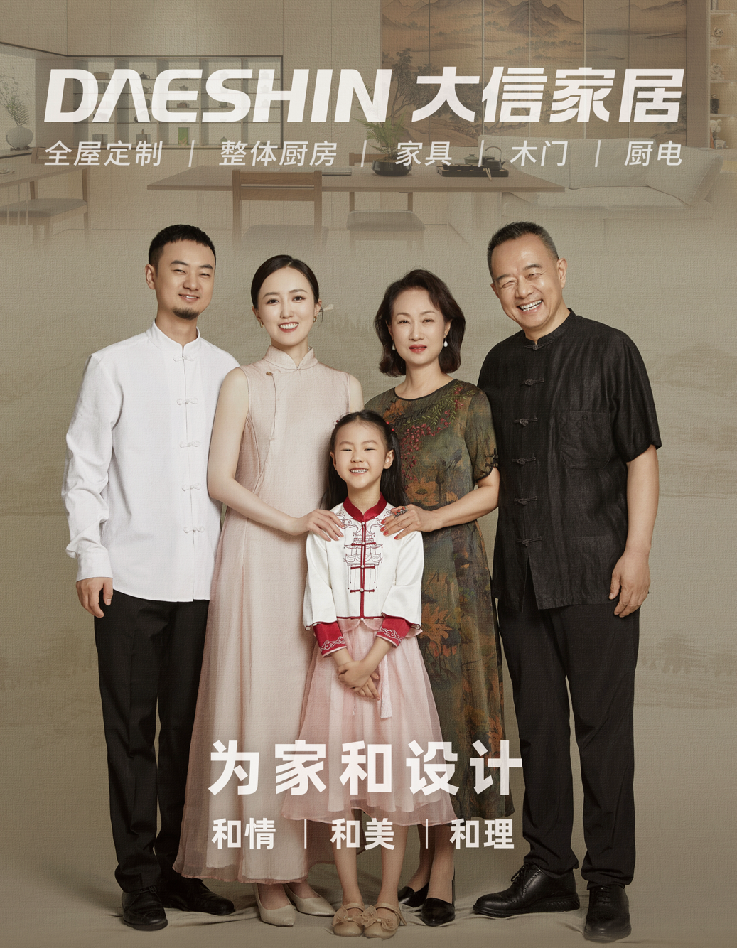 “和美”,是品牌的追求,是大信创造的终极价值。它既指通过设计、产品和服务,为每一个家庭打造出的视觉之美、空间之美、功能之美,把消费者喜欢的“美”做到极致;在更深层次,大信希望通过一个精心打造的家,促进家庭成员之间的和谐关系,营造其乐融融的生活氛围。一个“和美”的家,是心灵的栖息地,是情感的加油站。大信的家居,就如同一个温暖的背景,默默衬托着千家万户的团圆、欢笑与成长,这正是大信事业的崇高意义所在。