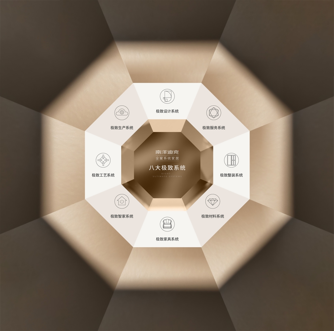 A:今年,我们将“南洋迪克整装家居”正式升级为“南洋迪克全案系统家居”。这不是简单的一个改名,而是未来锚定“全案系统”这一核心方向,通过八个系统维度的极致雕琢,建立南洋迪克的核心竞争力,这八大极致系统是: