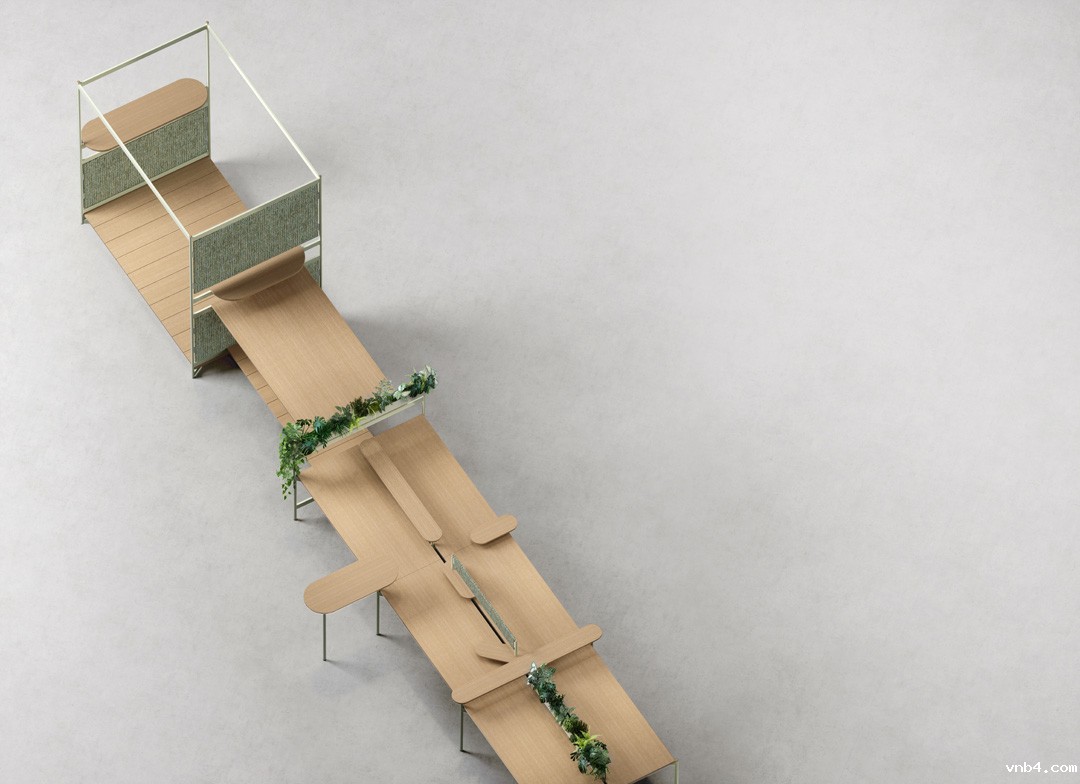 灵活多变的多功能办公空间越来越受青睐,办公空间设计也要适应从单人到团队的使用,轻松移动与组合的家具为这个空间创造了许多可能性。2019年,美时提出“邻里”概念,旨在提倡办公空间的社区化和家居化,它呼应了近年来空间类型模糊化、移动化和游牧式的办公形态以及联合办公模式的发展趋势,满足人们对办公环境的情感诉求。在“邻·享 美时新品巡回设计派对”上推出的新品Longhouse,恰好顺应了这样的办公新变化。Longhouse 与其说是一套办公家具,不如说是一个社区场所。它体现了设计师创造性的发散思维。