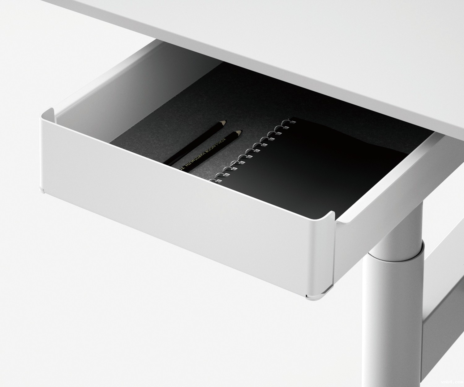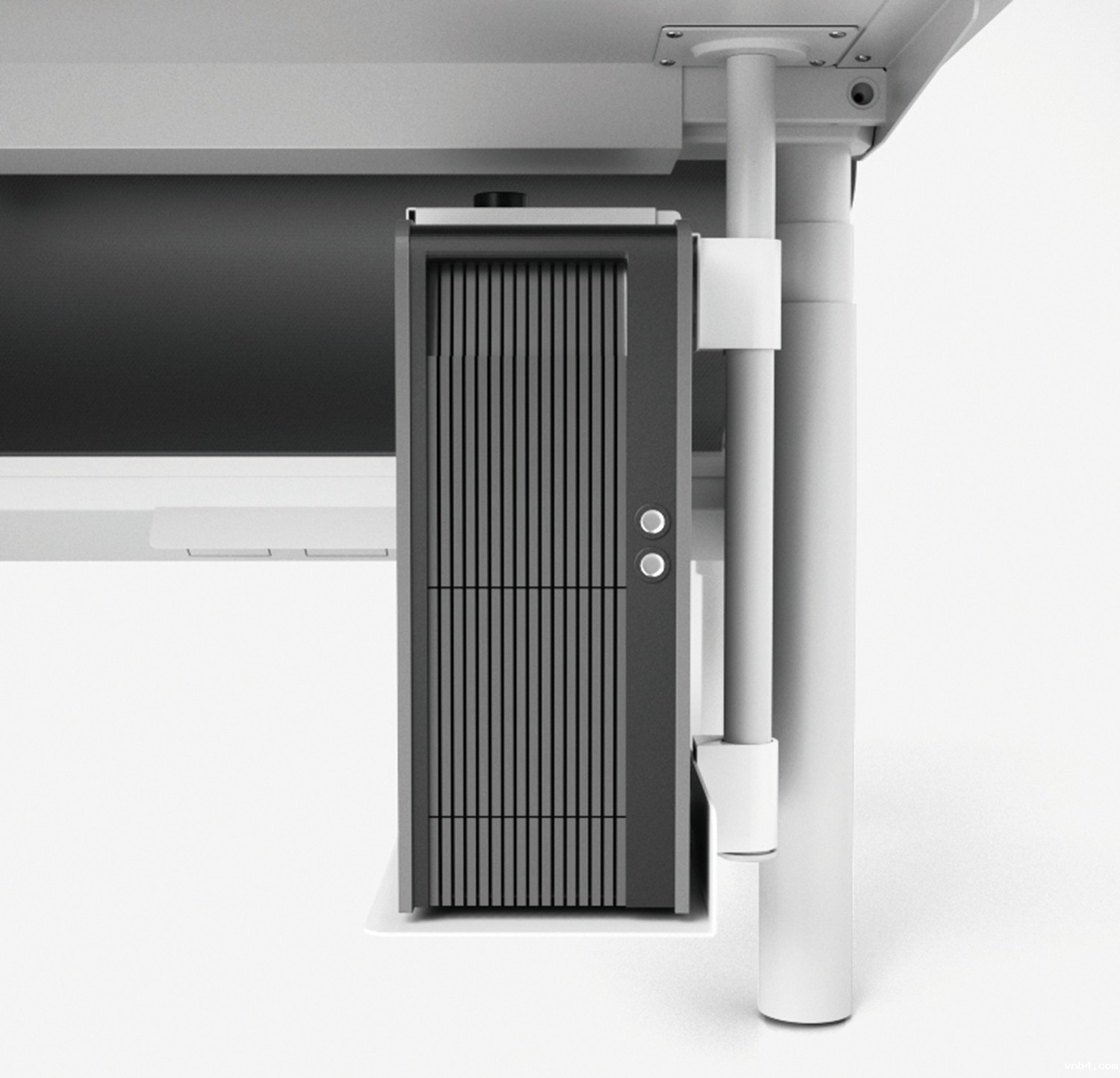 桌下可配置小型抽屉,便于随手收纳文具等物品。亦可配置主机箱吊架,随桌板同步升降,设备线路整齐不紊乱。