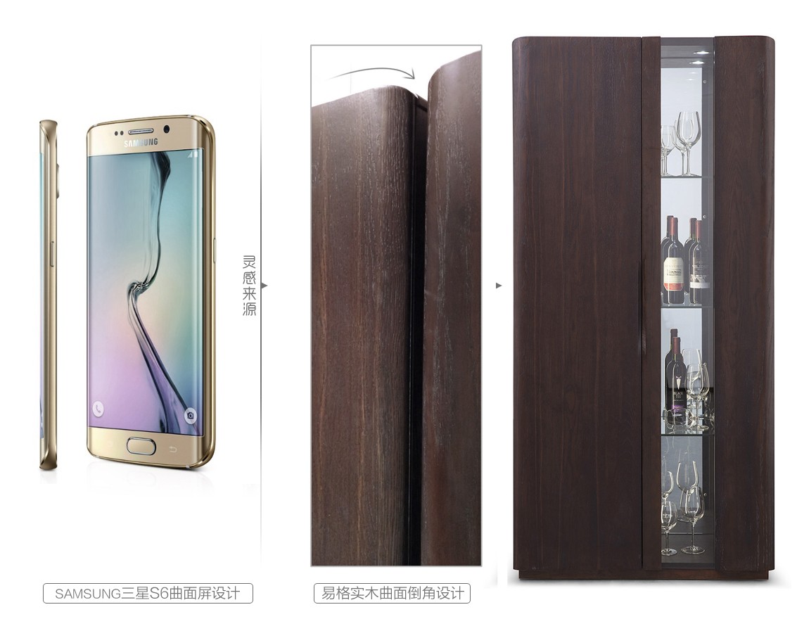 Hilker优客实木系列中另一个经典元素来源于王东升所使用的三星S6手机,他醉心于三星S6的曲面屏设计之美,因而受到启发,获得灵感。