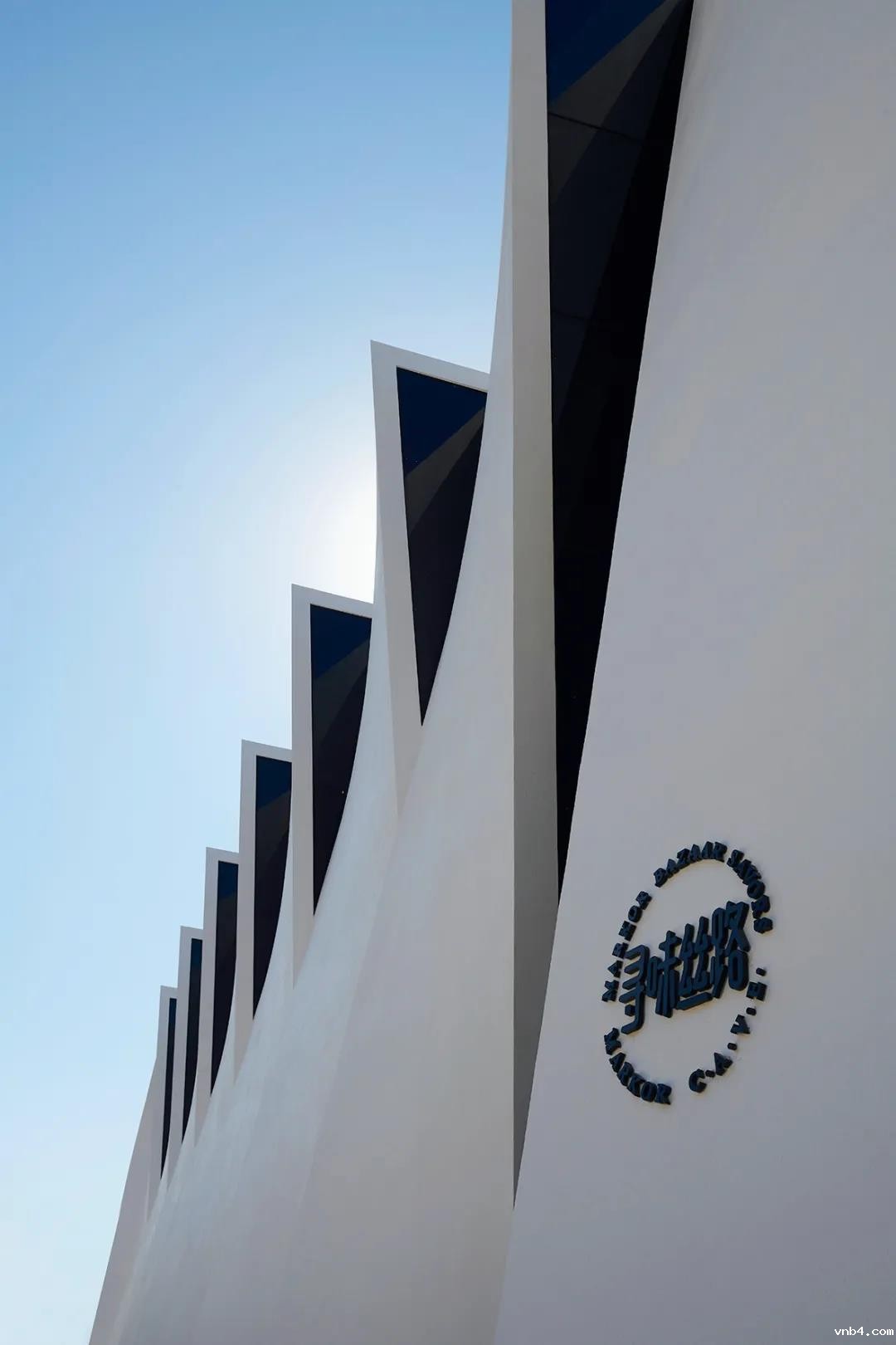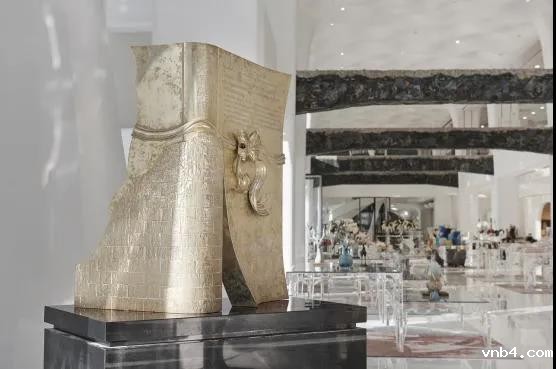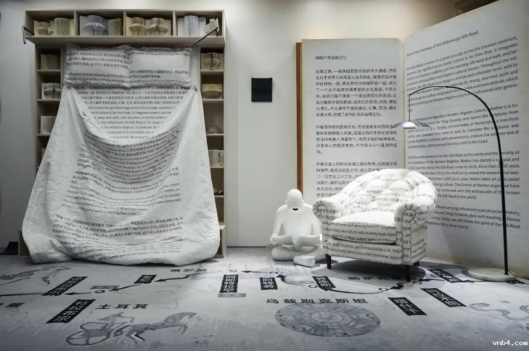 以书为艺术造型的雕塑,丝带环绕,神圣、唯美,承载着丝路文脉下人类居住文明传承的使命与责任,设计师的创作理念也记录其上。正面琢刻文字对美克洞學館作了精炼的诠释:美克洞學館——新零售艺术空间,Markor C.A.V.E.(Center for Artistic Visual Experience)