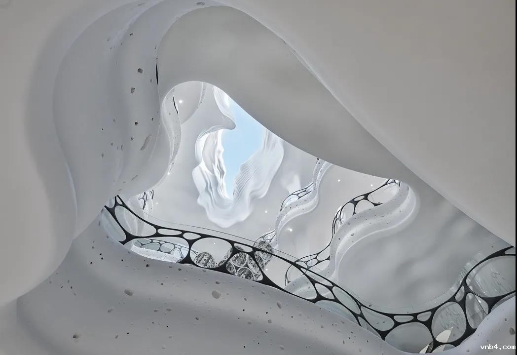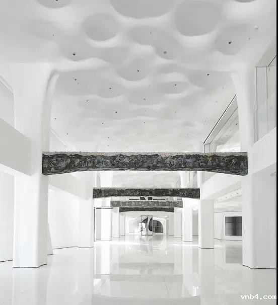 美克洞學館以洞穴作为意象载体,外立面现代、简约,有序列队组合的体块像从天而降的洁白石块,沉稳厚重;优美而富有旋律的线条又使它像自然灵动的白色羽翼,唯美轻盈。追求艺术的过程,实则是探索更优质的生活表达。