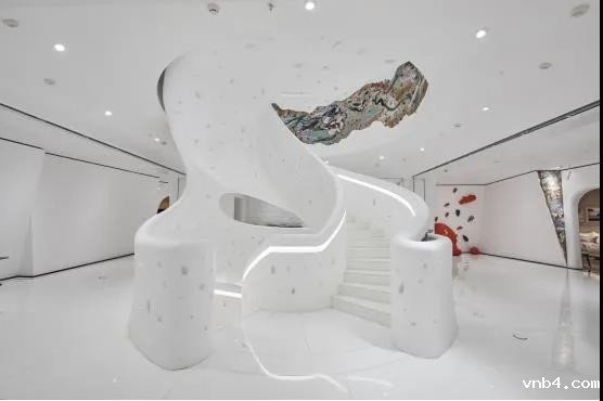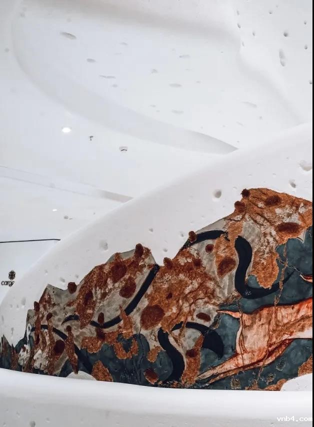 石窟云梯是连通美克洞學館B1和2层后庭的楼梯,内外双旋转结构设计。外侧由若干个大小不一的洞岩装饰,观感十足;旋转梯内侧由龟兹壁画中常见的“石绿、青金石、朱砂”三种矿物颜料构成,色彩鲜艳,对比强烈。