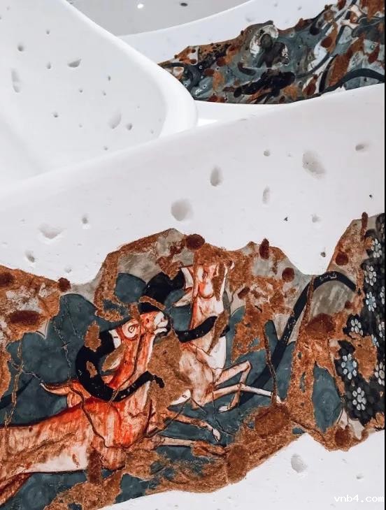 步入洞學館,设计师将龟兹壁画与原有建筑结构巧妙结合,赋之以全新的生命力和美学内涵。每根壁画承载了丰富的内容且大面积使用墨绿色,与周围洁白的环境形成强烈的色彩对比,具有极强的装饰性和视觉冲击力,平衡饱满,恢弘而富有秩序。