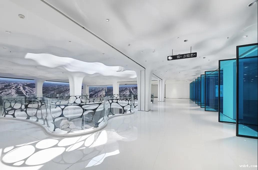 西域峡谷位于三楼中庭采光顶,造型灵感来源于西域白雅丹峡谷地貌并最大程度保留了天然地貌的不规则岩壁流线,不规则的天窗设计,带来拨开云雾见光明的心动瞬间,当午后的阳光倾泻而入,即便在馆内喝着咖啡,也能时刻保持与大自然之间的呼应和沟通。