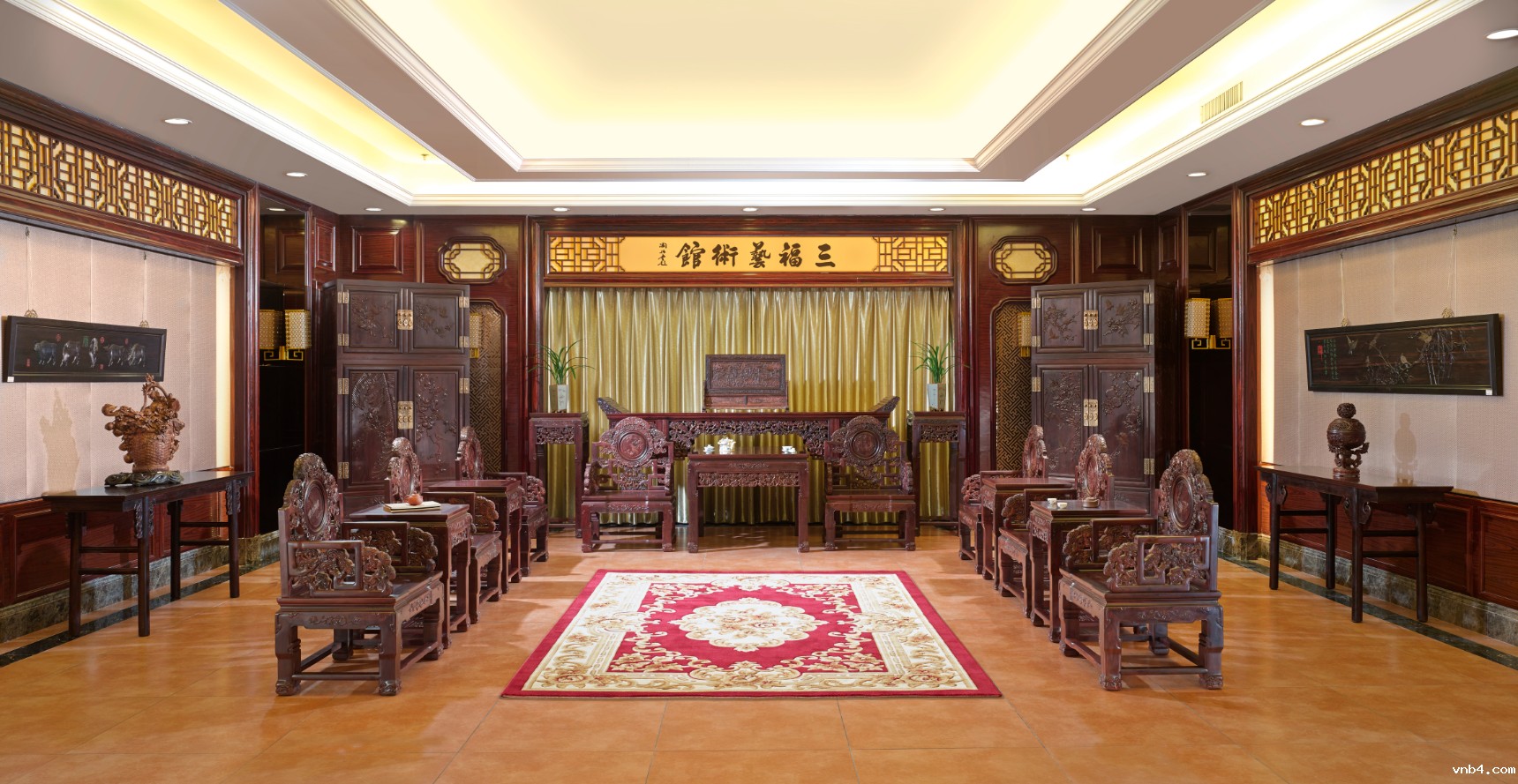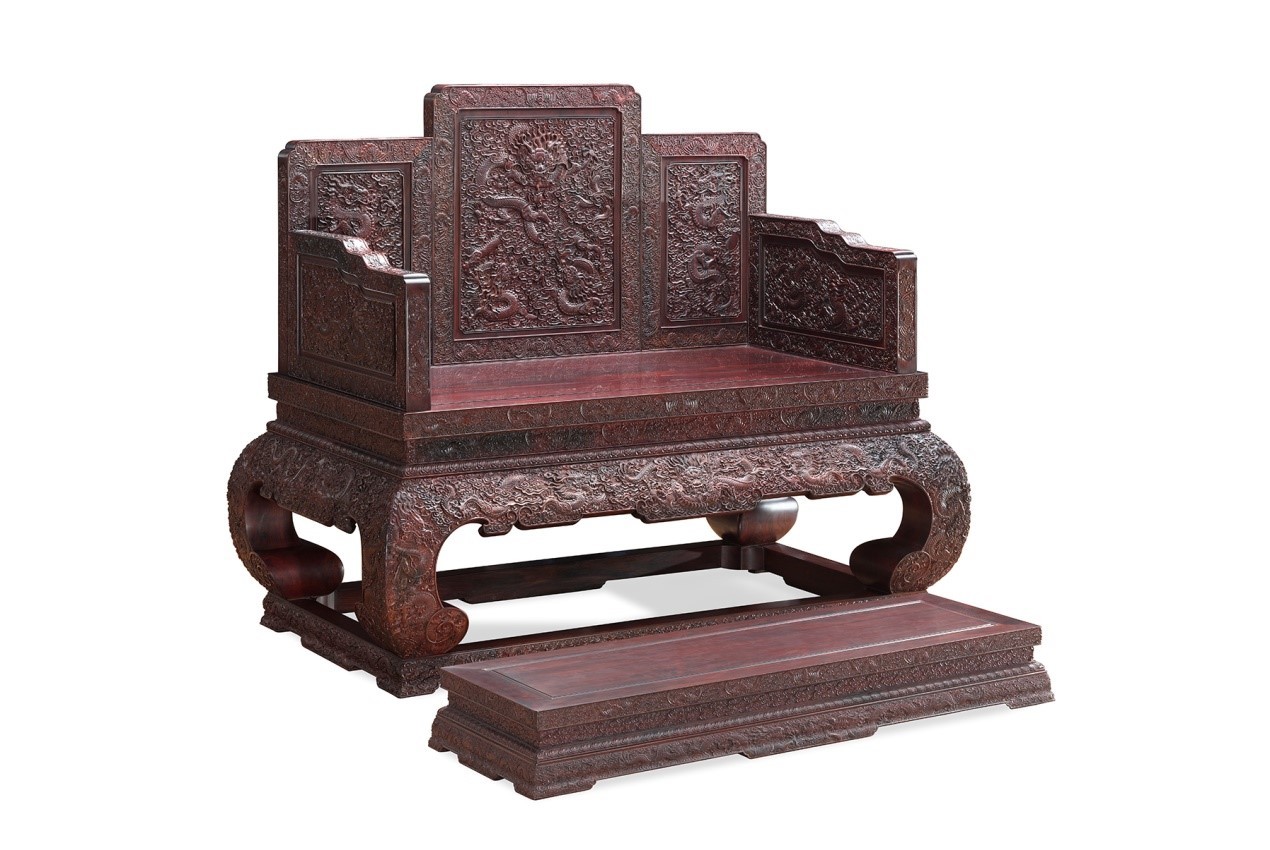 精选珍稀檀香紫檀,精雕细琢而成。座围七屏,梯状分列,恢宏壮观。双面浮雕,深浅融合,工精艺巧。屏板满雕云龙纹,藏露得宜,威武轩昂。雕工深入浅出,螭龙活灵活现,出云入岫,栩栩如生。座面打磨光亮如镜,边抹冰盘沿,与束腰、托腮均雕云蝠纹为饰,寓意鸿福吉祥。下接鼓腿膨牙,牙板用料阔绰,宽厚大气,牙腿亦雕云龙纹,愈显尊贵不凡。足端内翻马蹄,踏于托泥之上,沉雄稳健,落落大方。