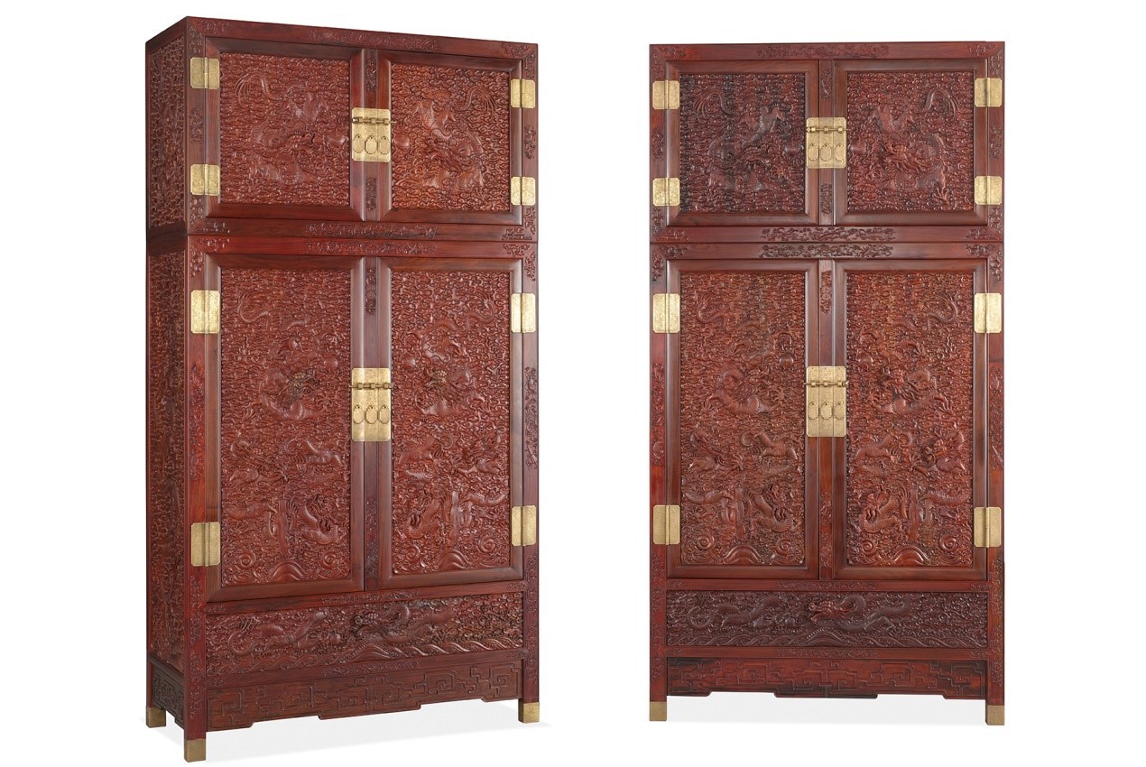 优选交趾黄檀,形制高大,肃穆庄重,由顶柜和底柜组成,一左一右,成双成对。四面满雕云龙,或为祥龙驾云,九天腾日,出云入岫;或为双龙戏珠,威武雄壮,动感十足。祥龙身曲如弓,腹部饱满,尽显叱咤风云气魄;蟠云层翻叠涌,如波似浪,一派绵延不绝之势。以浓墨重彩,见巧匠慧心。线条曲中藏直,行云流水之态;刀笔方里见圆,皇家贵族之风。华采富丽,挺秀且璀璨;精微生动,吉瑞而祥和。