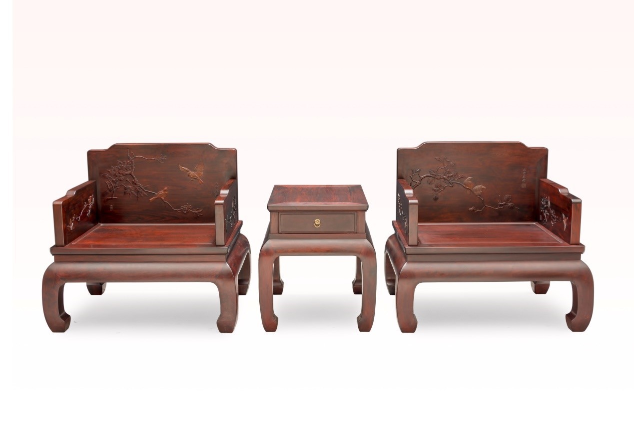 臻选交趾黄檀,精工打造而成。造型素雅清秀,匀称协调,挺拔秀丽;线条简洁流畅,刚柔相济,质朴大方。靠背板和左右侧板,浅浮雕工笔花鸟国画,以刀代笔,收放自如,鸟雀栩栩如生,羽毛丝毫毕现,形态逼真,跃然案上。座面攒框镶心,落膛安腰,鼓腿彭牙,内翻马蹄。整件作品结构严谨,做工精细,舒展稳重,温婉大气。秉传统而又创新,比例得当,布列有序;减厚实而增文隽,韵味自然,恰如其分。