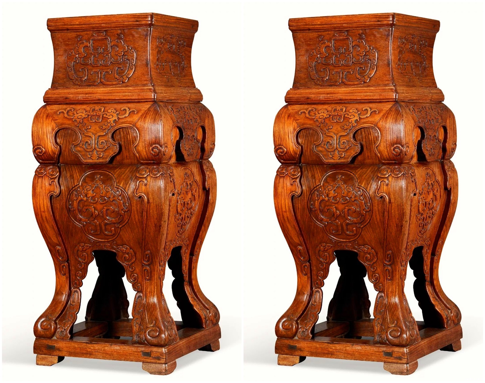 此台座形神不凡,用料豪奢厚重,造型沉稳壮硕。自上而下,台座分四部分,上部为凹肚方台,四面均浮雕双螭捧寿纹。台下为座身,看似分两截,实则一木连做。其上段为鼓腿膨牙,形如矮方几;下段则为三弯腿,四面安券口牙子,颇为宽大,半封半露,足端外翻卷云纹足。末承带龟足方托泥,泰然安稳。