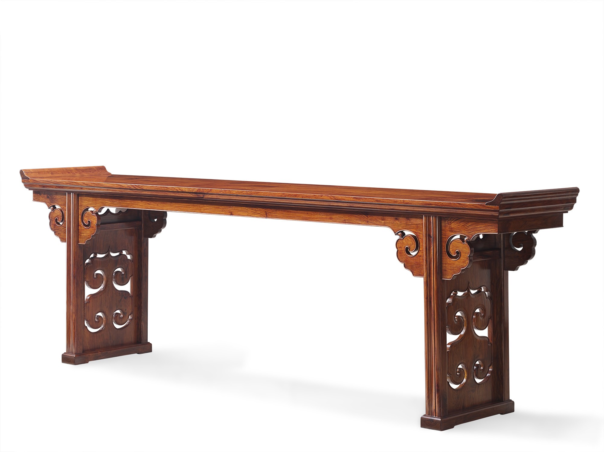 此案长3.86米,案面修广,气度不凡,两端置翘头,边抹冰盘沿做锼挖。面下夹头榫结构,素直牙条两侧锼出卷曲角牙。角牙乍看为寻常云纹,倘左右相连而辩,实呈倒悬灵芝之形。两腿侧嵌板,开光内透雕灵芝纹。四腿混面,两侧倒棱,中做锼挖,并起二炷香阳线,贯延上下,脚下承弓形托泥。此案用料虽厚,然设计巧妙,加以灵芝为饰,俞显文雅隽永。