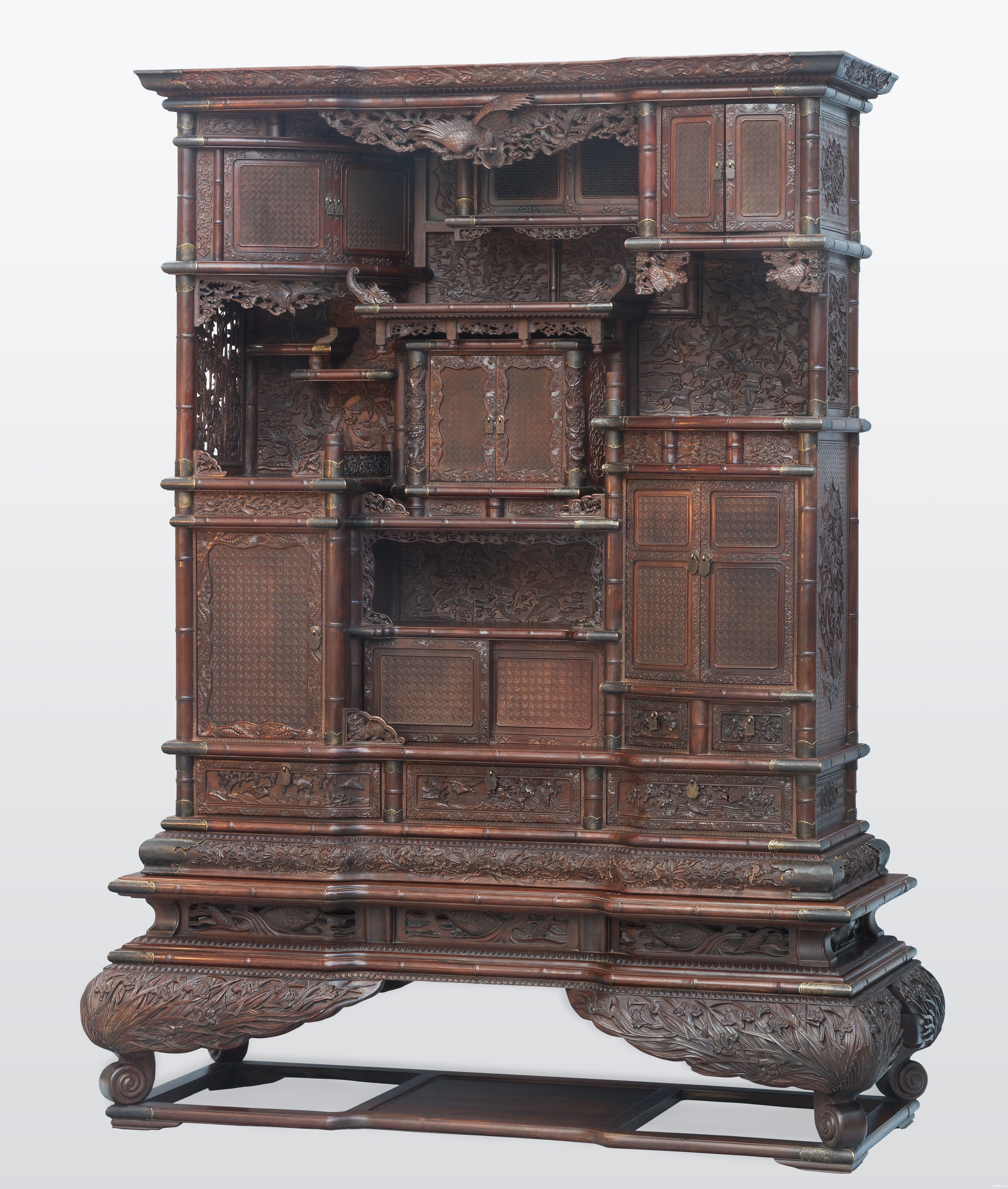 此多宝柜格依据上海博物馆藏品改制设计而成,原柜门为玻璃制,为求整体材质谐调统- -,故将柜门改为紫檀精雕锦地纹。柜身横竖边框与枨,仿竹材样式,意欲节节向上。牙条、牙角则以浮雕、透雕工艺饰花鸟纹,背板浮雕仙鹤祥云。此柜工艺深得清宫御制家具之形神意趣,极具观赏与收藏价值!
