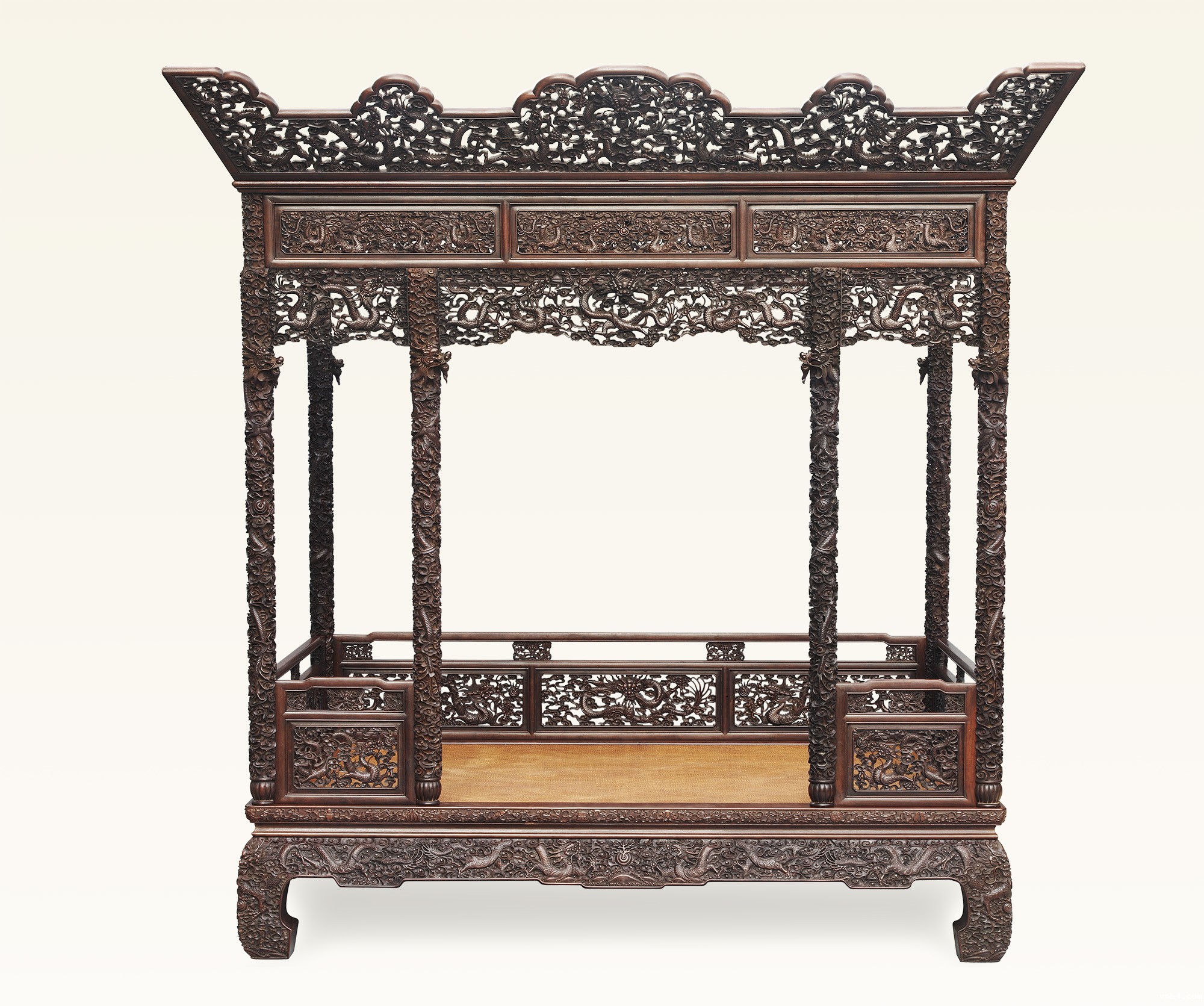 清式宫廷御用家具气韵精微奢华,望之构件繁复、雕饰谨密细致,于形式经营中必审定主次、虚实相生。若未能感悟此要旨,则仿作必失之繁缛纤糜。此床依据清宫旧藏之款型,以珍贵檀香紫檀精工细制。通体以镂空雕与浮雕满饰以蟠龙祥云纹,雕工精严缜密,格局森严华丽,尽现清宫御用家具之形神气韵,极具欣赏与收藏价值。