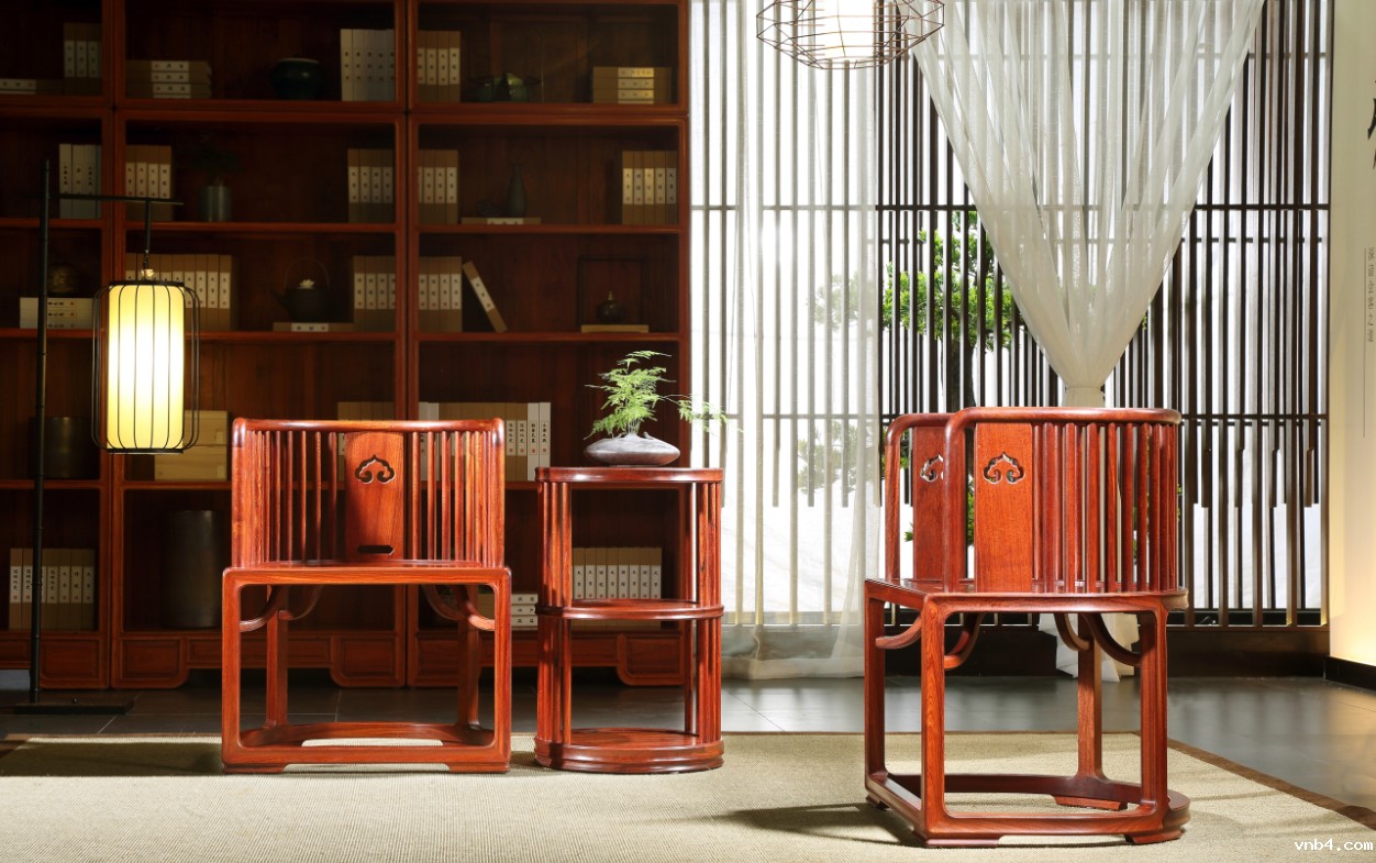 国寿椅上半部分借鉴直棂围子六角椅的靠背的造型,饰以如意云纹;坐面采用藤编加硬木板,椅腿采用凹面线,并用霸王枨与椅面连接;腿足采用龟足托泥,椅子四腿以粽角榫与坐面和托泥连接,整个椅子刚中带柔,端庄沉穆之余兼具清雅空灵之文人气质。采用的粽角榫、凹面线、霸王枨、直棂式样、如意云纹,是国寿红木新明式红木家具品牌——世外桃源中大量使用的元素,它并没有新创造的元素,有“明之余味”,但是又给人耳目一新的感受。