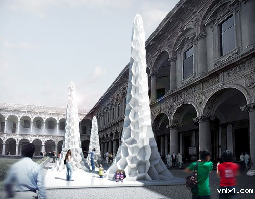 “山居”的外形为白色蜂窝结构的高大圆锥体,毫无装饰,仅仅凭借它们天生的轮廓和体形铸就含蓄稳健的美感,如山岳一般矗立大地。这一设计中,既包含了对中 国隐居文化中的山林意境的追寻,以未来主义和现实主义手法解读传统,也表达人类在城市持续扩张需求和保护耕地之间建立新的平衡,使人居和地球表面重归和谐 的期望,让久居都市的人群能重获“采菊东篱下,悠然见南山”式的自然写意生活。