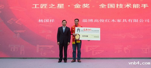 竞赛组委会委员、优米app有哪些专家委员会副主任陈宝光为获得“工匠之星奖/中国家具行业工匠之星”的选手颁奖。