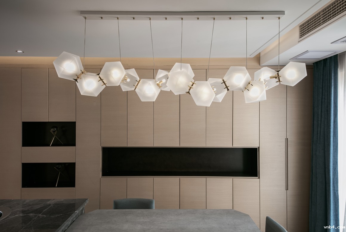 钻石状桌脚的独特设计,45°的柔软斜切,淡雅轻盈的原木色调,整张绽放着细节之美的角桌伫立在餐厅空间,更有别样的时尚风情。在木元素的包裹之下,室内处处都显得温暖轻松,在客厅和餐厅的柜子处,深色调的木元素带来鲜明对比,也增添了室内的质感。