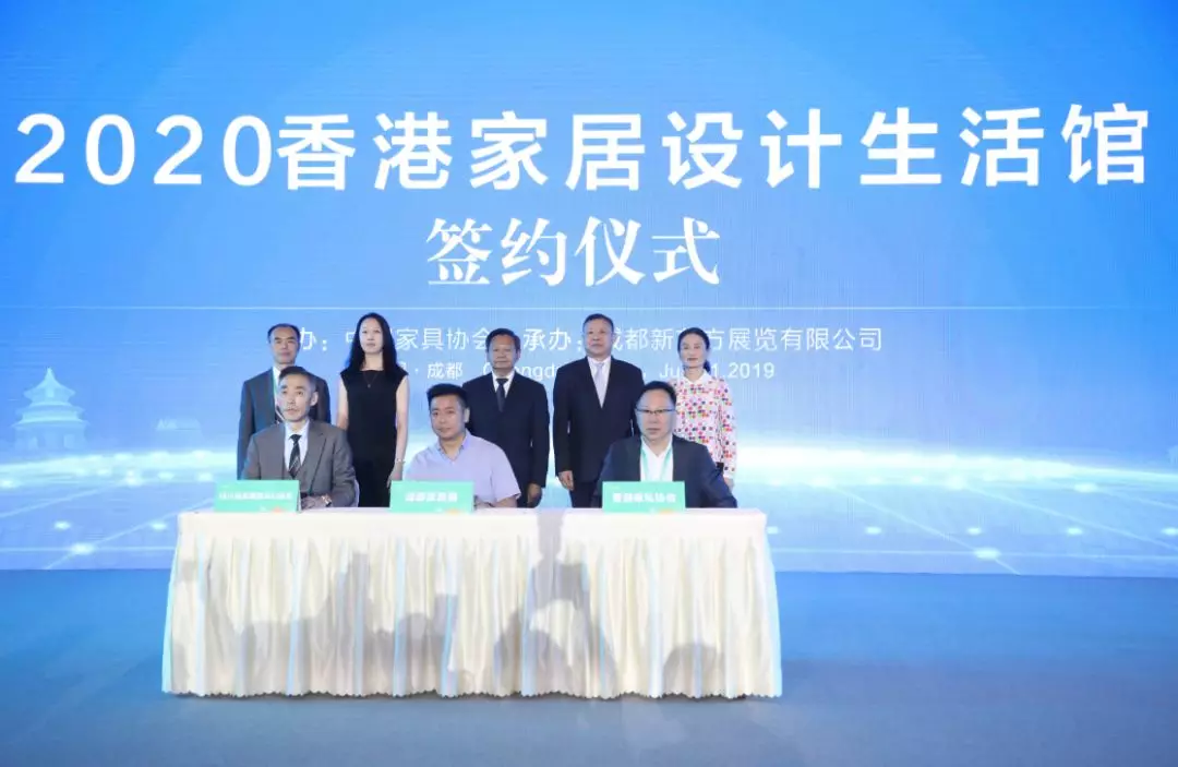会上,成都新东方展览有限公司副总经理姜华,四川省家具进出口商会秘书长荣煜伟,香港家私协会主席张呈峰,就2020年香港家居设计生活馆落地成都家具展签署合作协议。