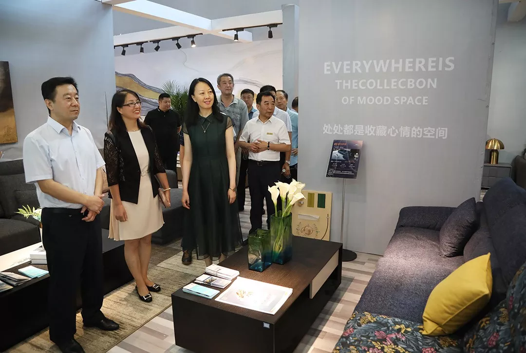 副理事长屠祺(前排左三)、河北省工信厅副厅长邵建华(左一)、河北省家具协会理事长李凤婕(左二)参观展会