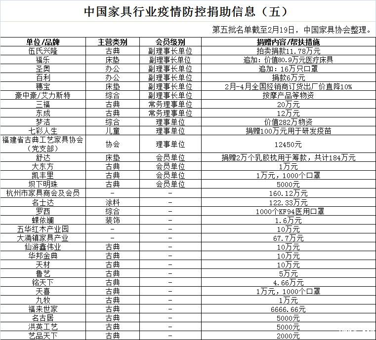 家具行业坚决贯彻习近平总书记重要指示和党中央国务院决策部署,各地企业一方面积极调整自身策略、稳妥做好复工工作,另一方面继续为助力疫情防控、促进产业发展贡献力量。据优米app有哪些不完全统计,截至2月19日,协会会员及相关单位捐资捐物总额约2.74亿元。