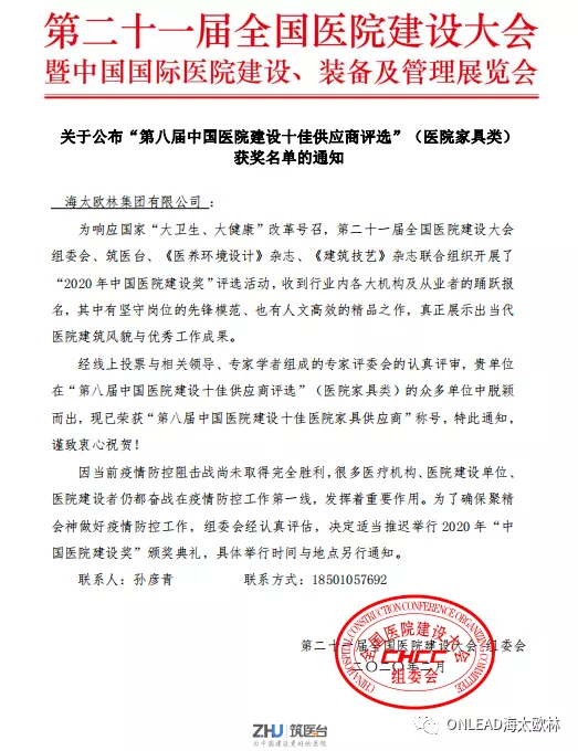 日前,第二十一届全国医院建设大会组委会、筑医台、《医养环境设计》杂志、《建筑技艺》杂志联合组织开展的“2020年中国医院建设奖”评选结果揭晓,海太欧林集团凭借人文科技、绿色健康的医疗家具产品,在众多医院家具厂商中脱颖而出,荣获“第八届中国医院建设十佳医院家具供应商”称号。