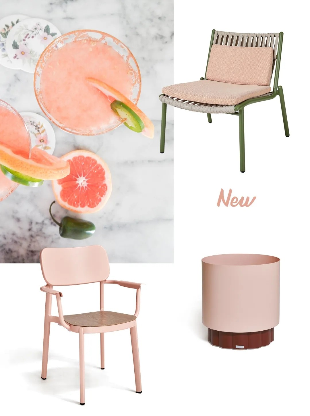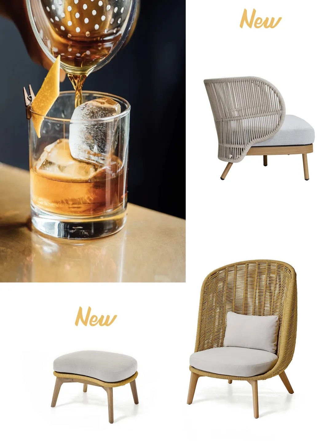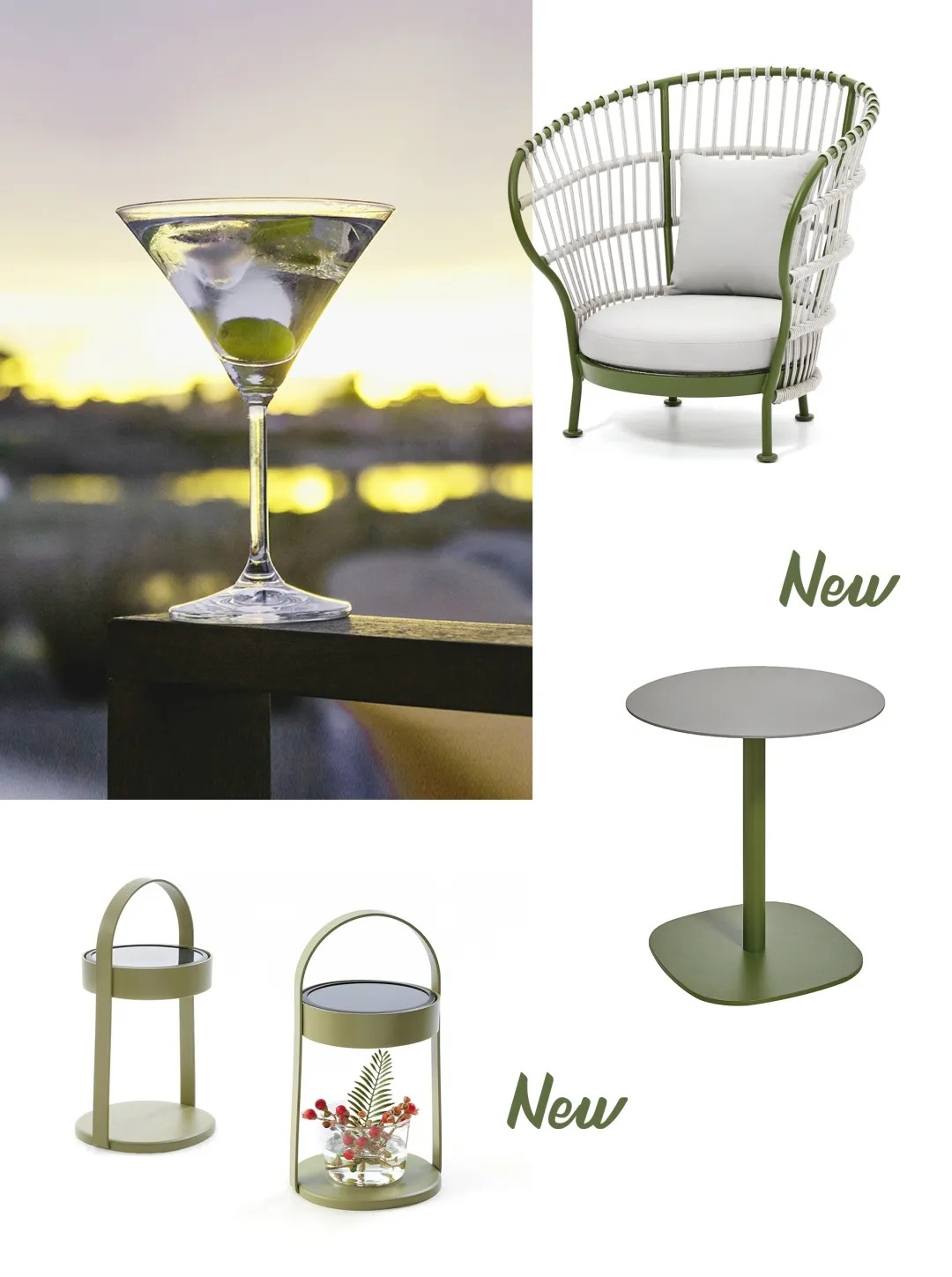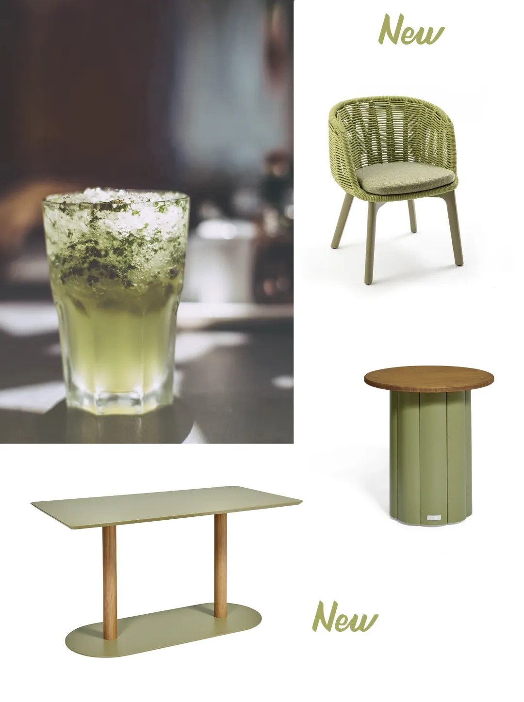 1.琴蕾酒特调采用伏特加、新鲜黄瓜汁、青柠汁、糖浆、罗勒叶调制而成。2.Bagel餐椅「新品」推出全新清爽配色,椅腿及椅身采用同色系,强调整体感。3.Lotus边桌结合竹木元素,搭配绿色叠瓣基座,营造森系自然风。4.Loop餐桌「新品」用下圆上方的简洁设计,表达更年轻、活泼的户外生活方式。