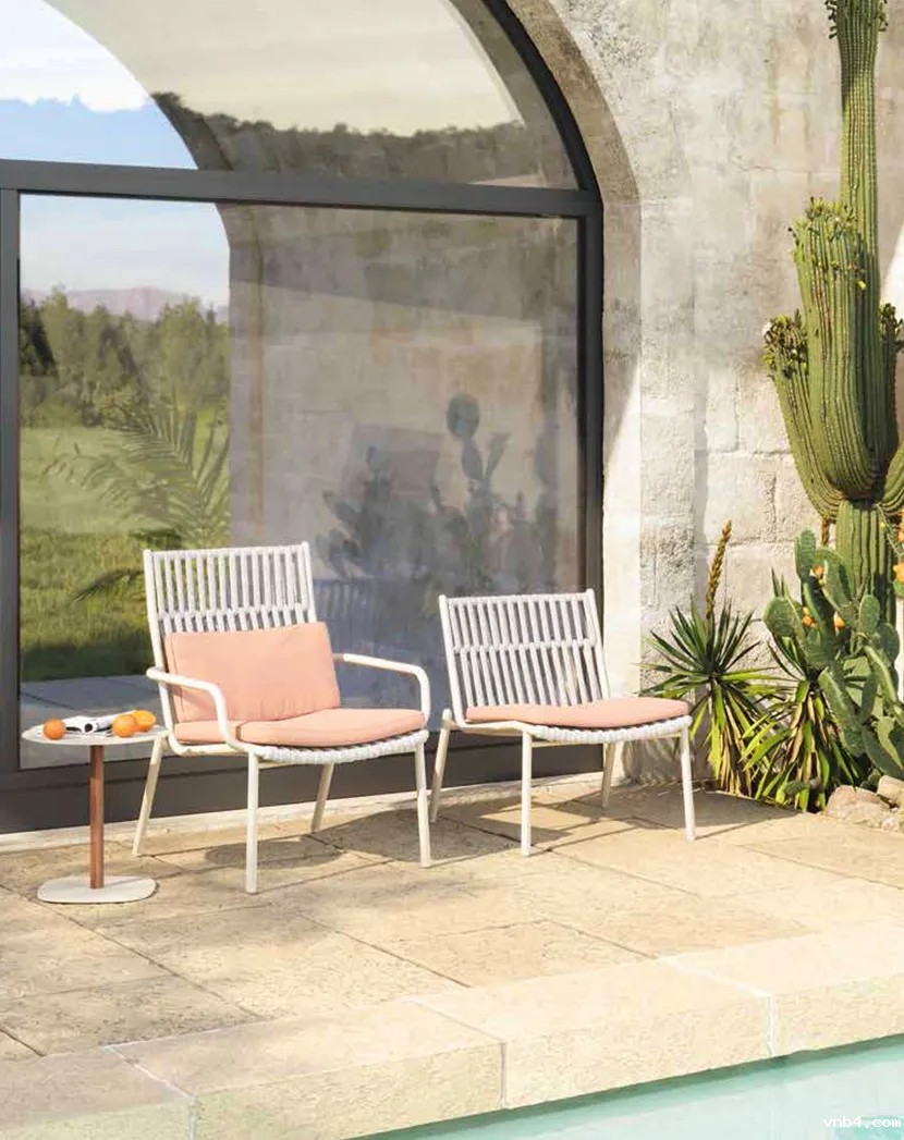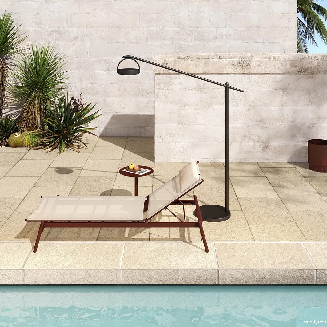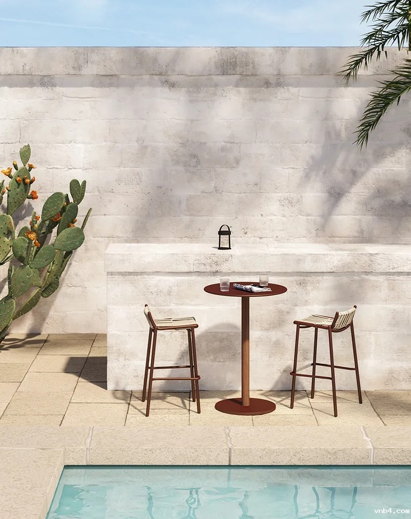 近似于中国传统绛红色的躺椅、吧桌椅组合,适合海滨、湖畔、泳池边等户外区域,能够与碧水蓝天产生色彩互补效应,让整体环境更有层次感和特色。