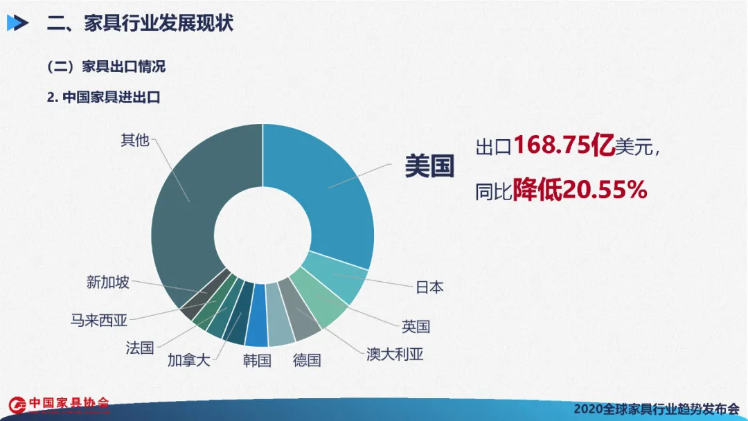 2019年中国家具主要出口到美国、日本、英国、澳大利亚、德国、韩国、加拿大、法国、马来西亚、新加坡等国家和地区。受中美贸易摩擦影响,中国向美国累计出口168.75亿美元,同比降低20.55%。美国作为中国家具最大的目标市场,对其出口面临巨大阻力。对于中国出口企业来说,出口转内销或拓展新市场成为不得不面对的局面。