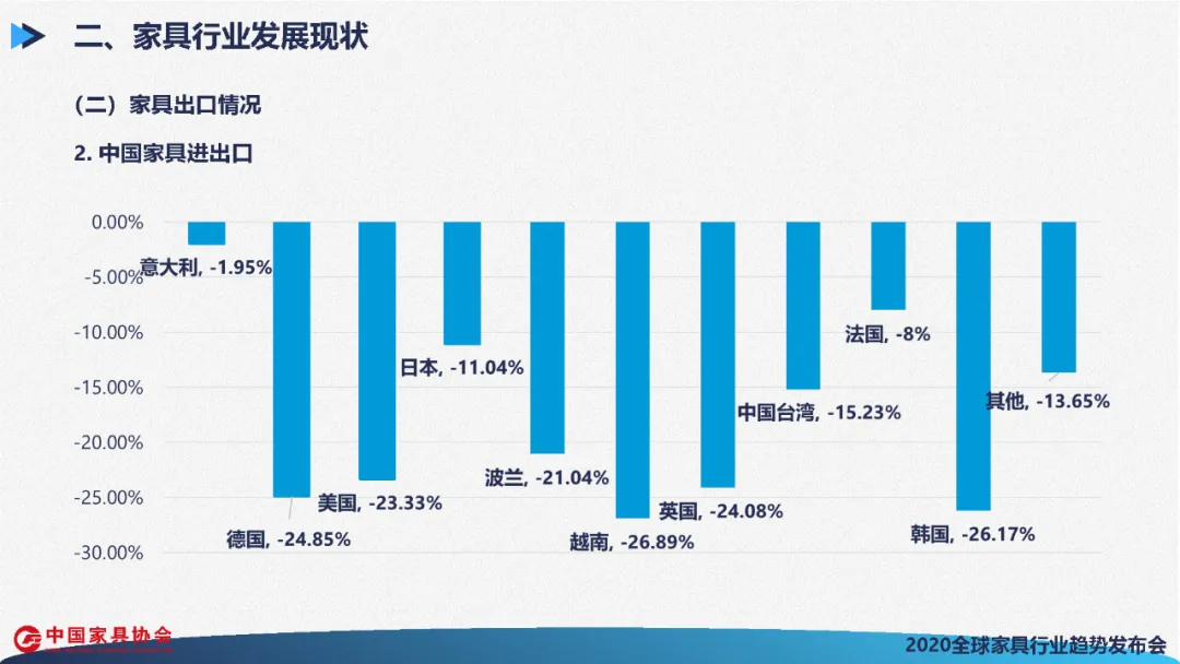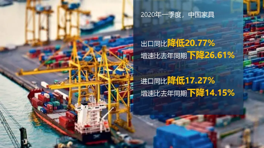 2020年一季度,中国家具出口同比降低20.77%,比去年同期下降了26.61个百分点。进口同比降低17.27%,比去年同期下降了14.15个百分点。进出口增速同时大幅下降,是中国加入WTO以来从未出现过的。反映出中国家具国际贸易受疫情和经贸摩擦等多重因素叠加影响较大。