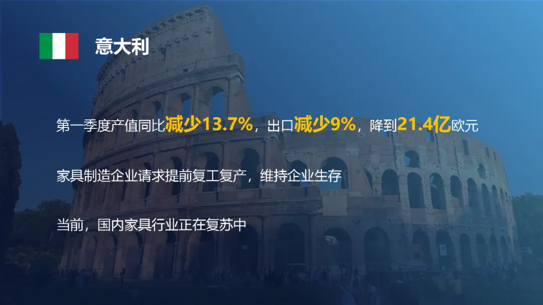作为欧洲地区受疫情影响最严重的国家之一,意大利的家具行业面临着很大压力。第一季度,意大利家具产值同比减少了13.7%,而出口值减少了9%,降到了21.4亿欧元。在意大利全国停工停产隔离管控期间,家具制造企业经历一个多月的停摆后情况艰难,向政府请求提前复工复产,维持企业生存。当前,意大利已解除管控,向欧洲邻国开放边境,国内家具行业正在复苏当中。