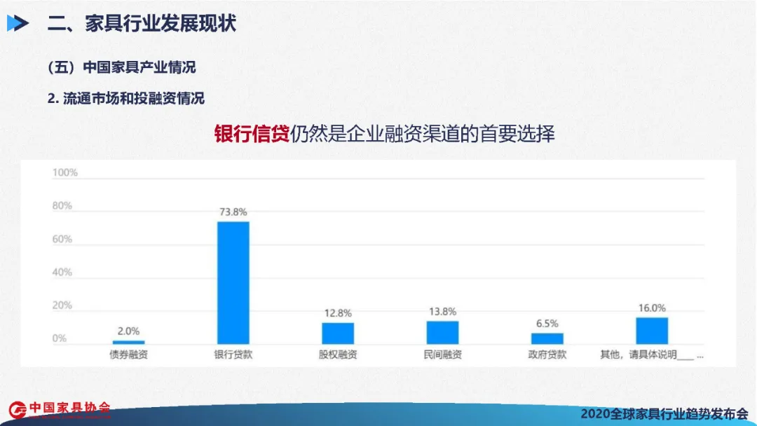 从调查数据看,银行信贷仍然是中国家具企业融资的首选渠道,占比达73.8%,除银行贷款外,14.8%的企业复选股权或债券渠道,以大企业或上市企业为主,13.8%的企业复选民间融资,以小企业为主。反映出大、中、小型家具企业的融资渠道略有不同,融资难问题依然存在。