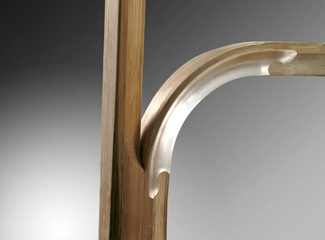 郁口是特有而优美的弯曲节点,该设计将其延展并运用至现代材料竹集成材,体现了一种对传统工艺的现代化应用与延展。利用竹的特性将其弯曲节点部分做的轻薄,整体框架仅由一片竹板弯曲而成,通过加厚部分稳固造型强度,全包围的结构与竹纤维的顺向也使纤细的外观能够承受强大的压力。