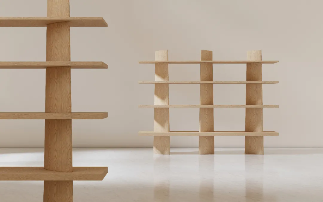 两种大小模块的架子,能够根据自己的喜好与空间摆放出千变万化的组合方式,书架之间通过隐藏的强磁来连接,磁铁藏于框架加厚部分内部,既不影响外观,又能使其达到稳固与自动对齐贴合的效果。