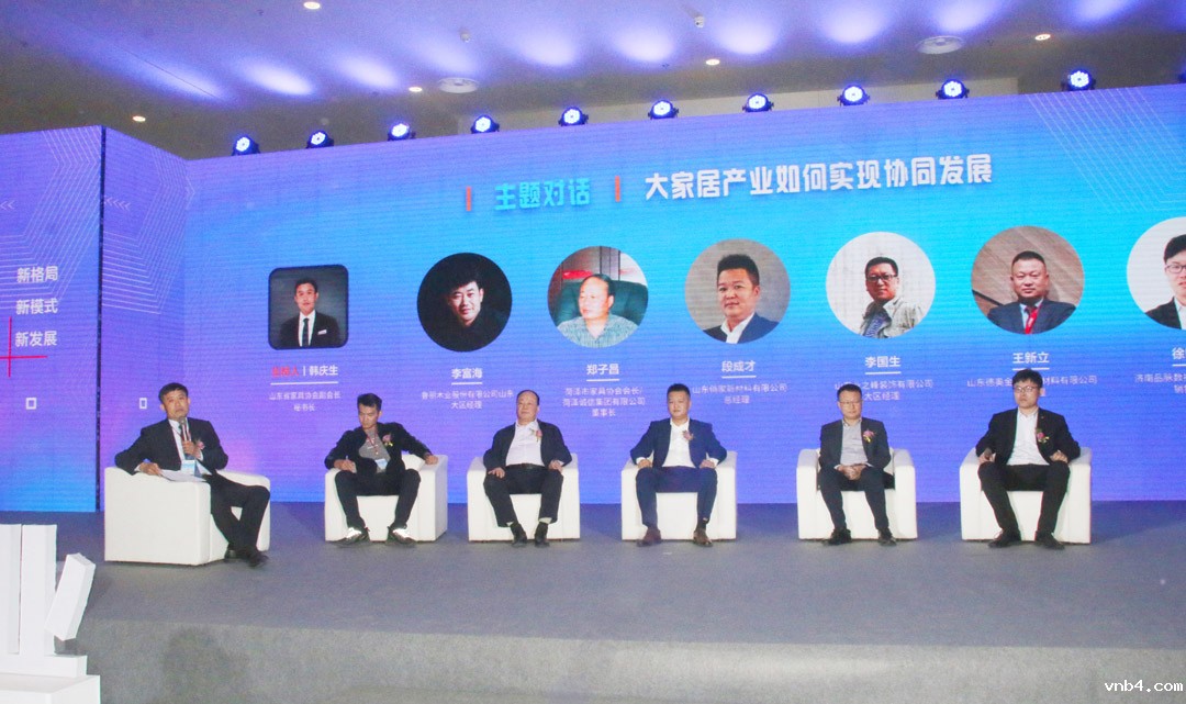 本次论坛主题对话阶段,鲁丽木业股份有限公司山东大区经理李富海,山东俏家装饰新材料有限公司总经理段成才,菏泽市家具协会会长、菏泽市诚信集团有限公司董事长郑子昌,山东德奥金森装饰材料有限公司总经理王新立,济南品脉数控设备有限公司销售经理徐晓辉,以大家居产业协同发展和未来发展前景及未来发展思路为主题畅所欲言,就产业趋势、智能制造、材料创新、渠道开拓、大家居协同等要素展开对话与碰撞。山东省家具协会副会长兼秘书长韩庆生主持对话环节。