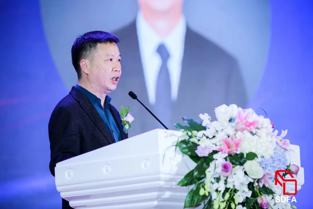 山东省轻工集体企业联社党组书记/理事会主任王哲军首先致辞。他提出,当前,受百年变局和世纪疫情交织影响,作为重要的传统优势产业和民生产业,家具行业要深刻认识到错综复杂的国际环境带来的新矛盾新挑战,要增强机遇意识和风险意识,认清国内国际双循环发展大势,贯彻新发展理念,构建新发展格局,推动更高质量发展,同时坚持创新发展、绿色发展、开放发展、融合发展,走出一条特色化发展路子。