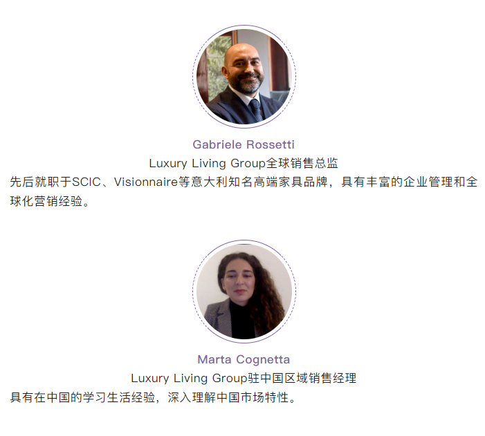 Luxury Living Group是全球顶级的国际奢侈家具集团,业务涵盖高品质意大利家具的设计、生产、分销,旗下品牌包括:Versace、Dolce&Gabbana、Trussardi、Bentley Motors、Bugatti、Luxence Luxury Living。Luxury Living Group注重家具工艺、产品试验、材料品质,通过细节的不断打磨,在传统与创新中,寻求创造、优雅、设计态度。