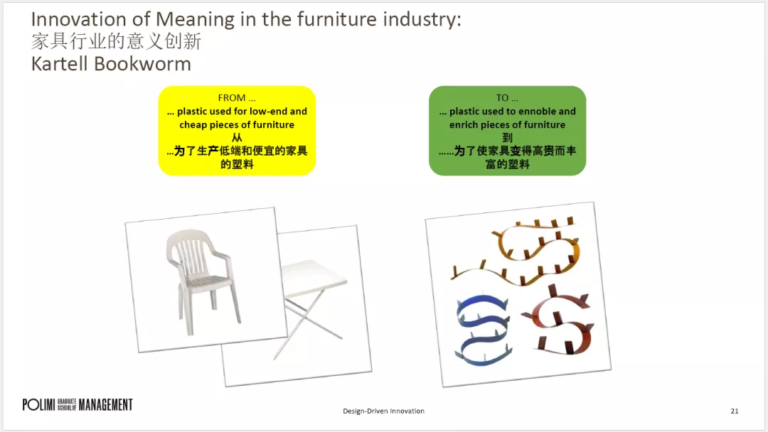 6月16日,中意设计创新基地-家具行业高级研修班-设计驱动创新项目主任、米兰理工大学管理学院设计战略全职教授Claudio Dell'Era围绕“设计驱动创新的价值”主题授课。他从众多消费行业的发展共性出发,强调“人”作为创新主体的重要作用,分析了家具行业先后历经了制造材料、产品设计、生活理念三个维度的创新阶段。